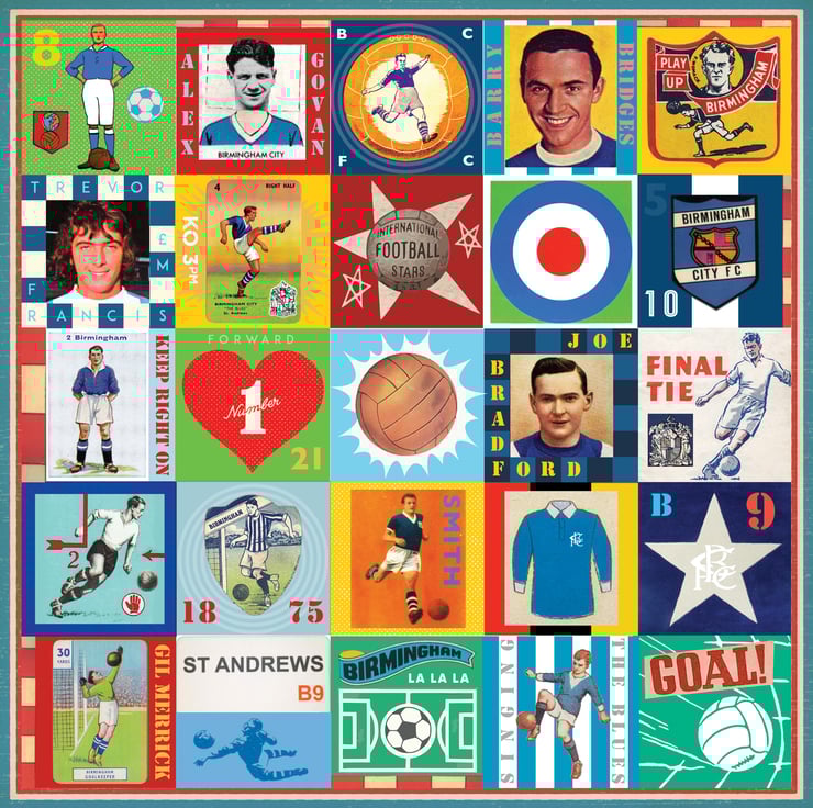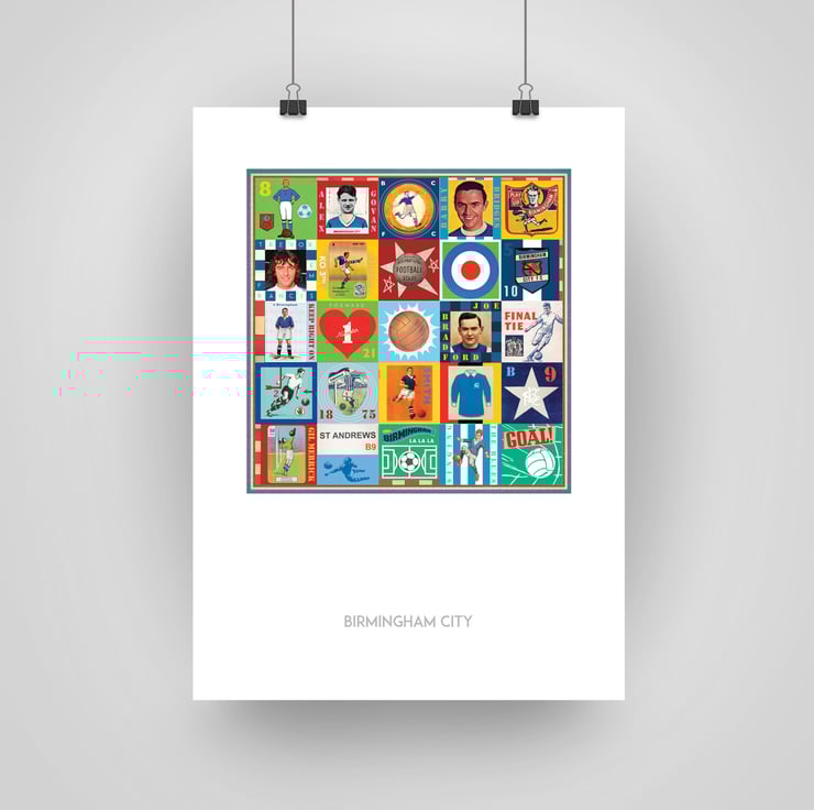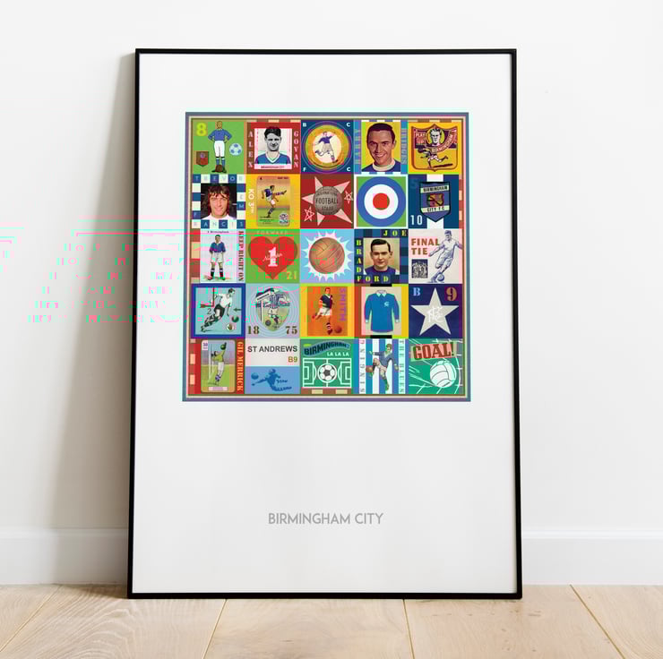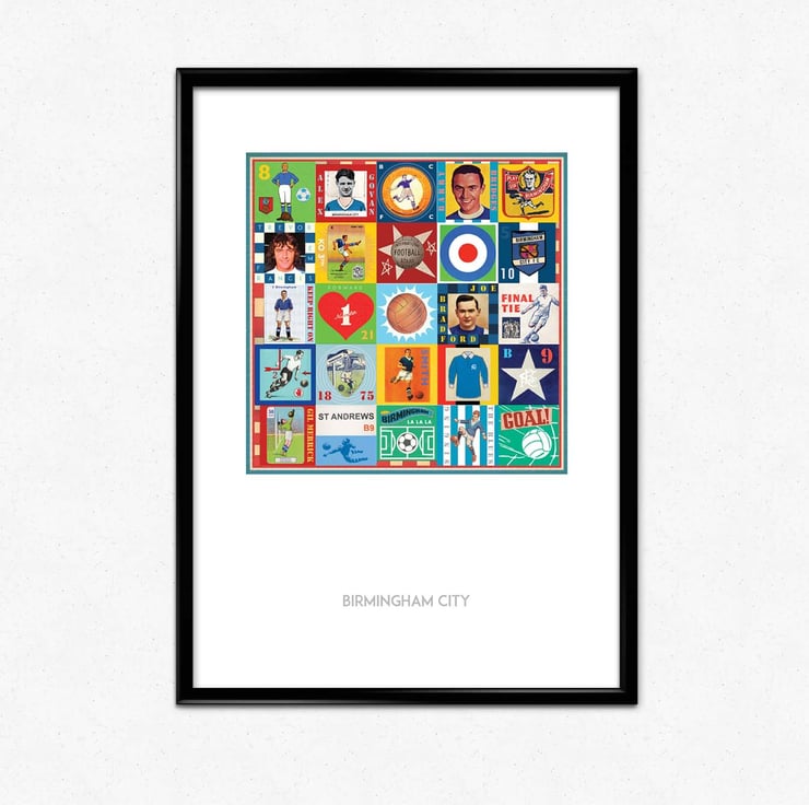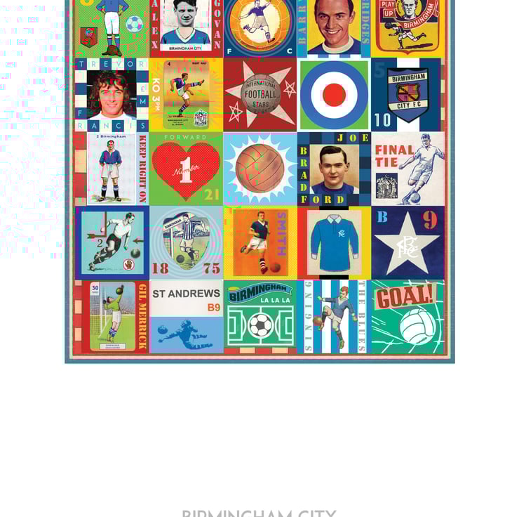 Celebrate the proud history of Birmingham City with this unique Pop Art Print, featuring vintage images & memorabilia capturing and celebrating the rich heritage, history and Club legends. This print is the perfect tribute for any true Birmingham City supporter.