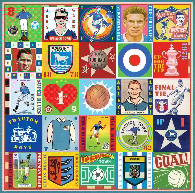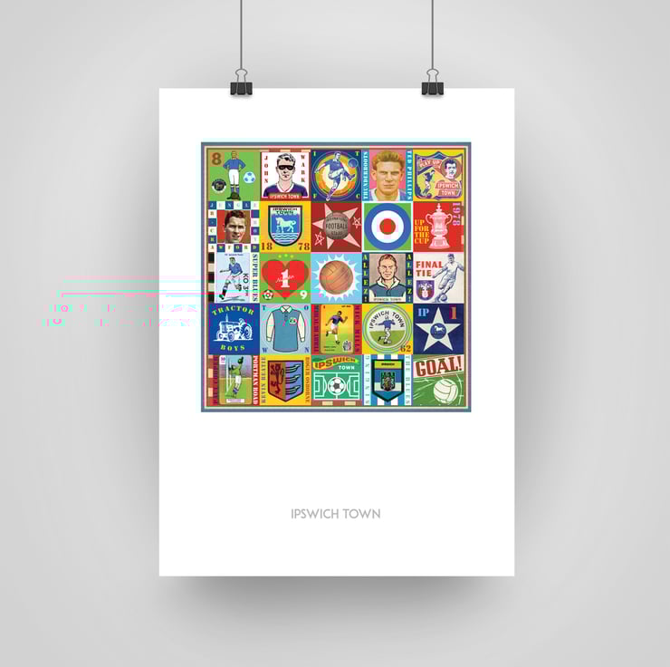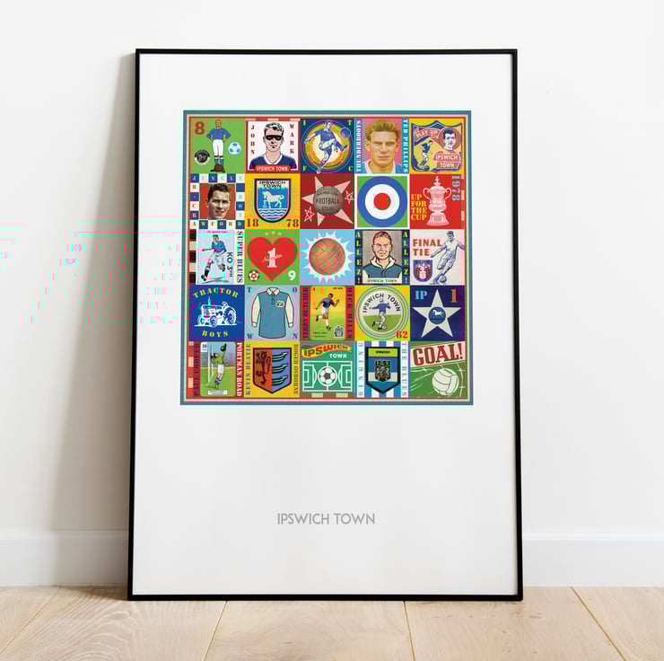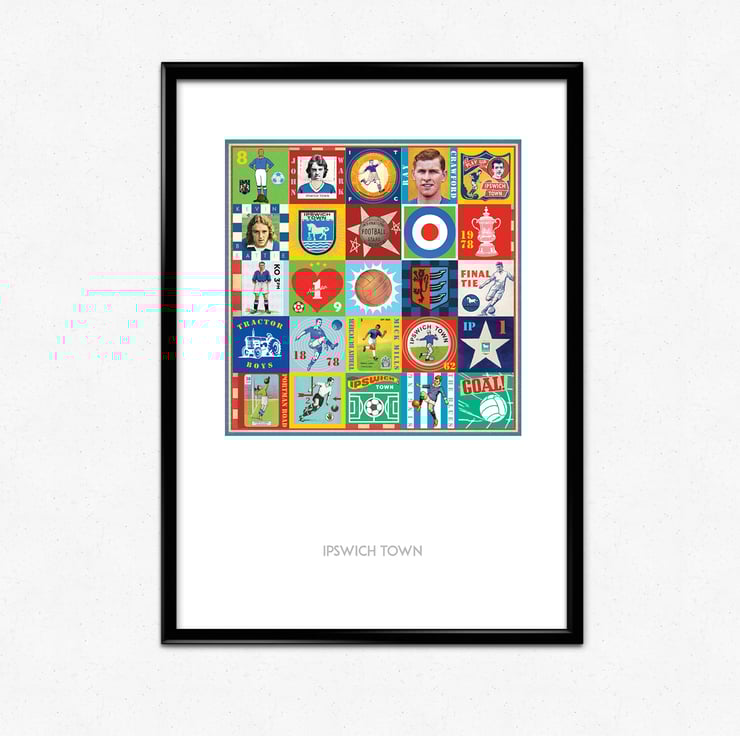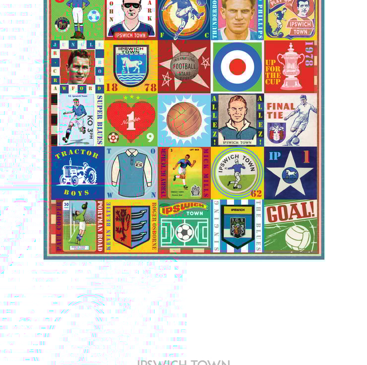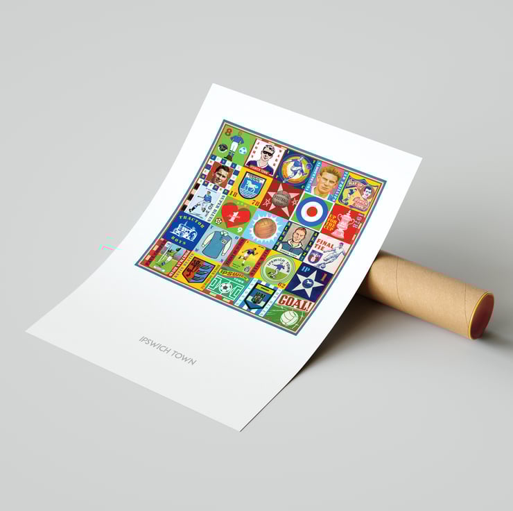 Celebrate the proud history of Ipswich Town with this unique Pop Art Print, featuring vintage images & memorabilia capturing and celebrating the rich heritage, history and Club legends. This print is the perfect tribute for any true Ipswich supporter.