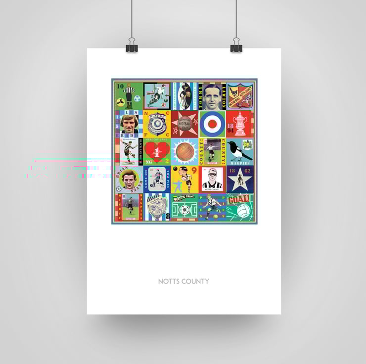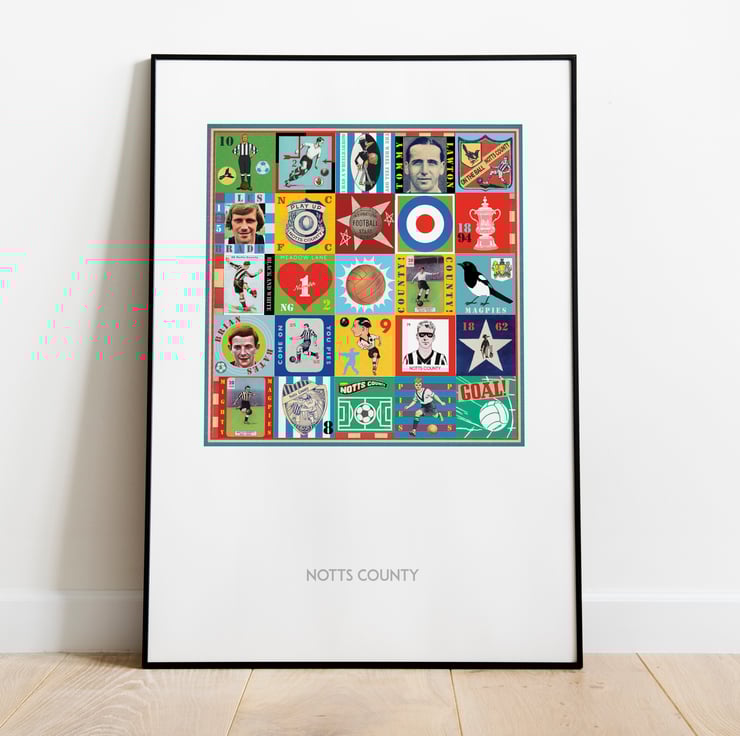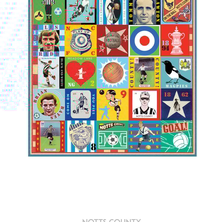 Celebrate the proud history of Notts County with this unique Pop Art Print, featuring vintage images & memorabilia capturing and celebrating the rich heritage, history and Club legends. This print is the perfect tribute for any true County supporter.