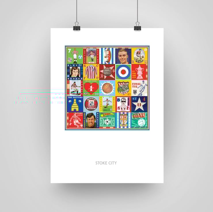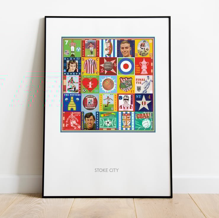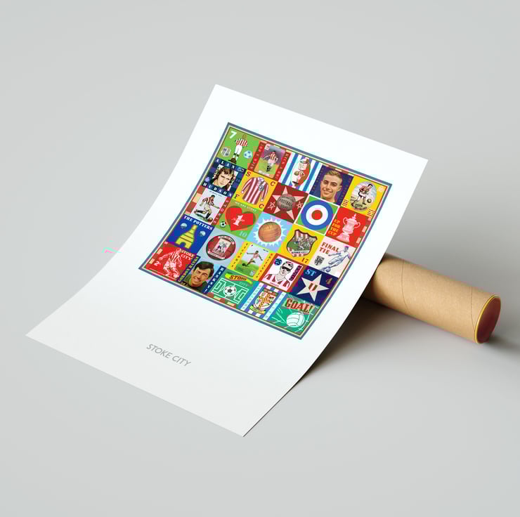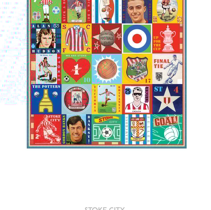 Celebrate the proud history of Stoke City with this unique Pop Art Print, featuring vintage images & memorabilia capturing and celebrating the rich heritage, history and Club legends. This print is the perfect tribute for any true Potters supporter.