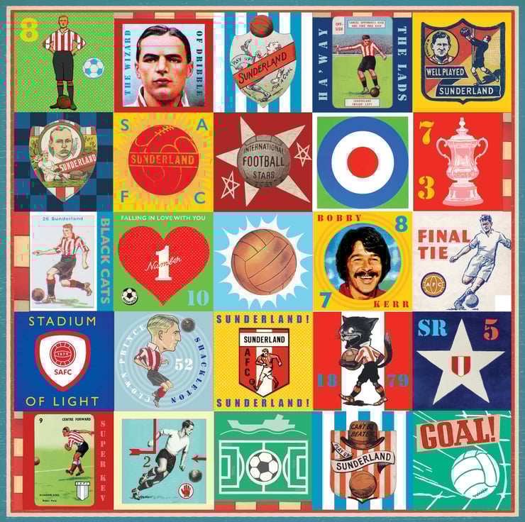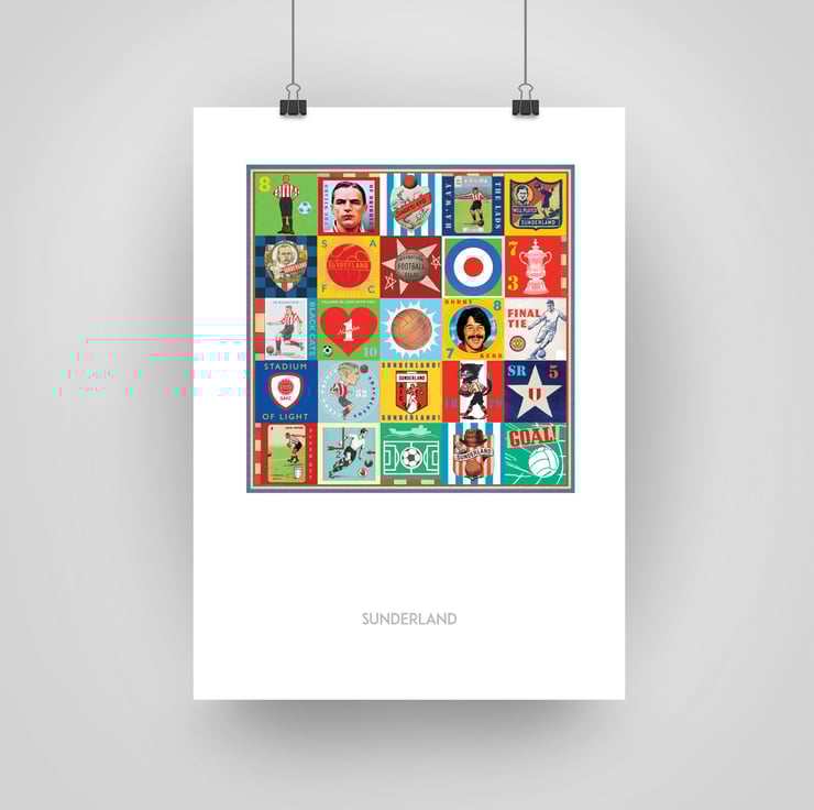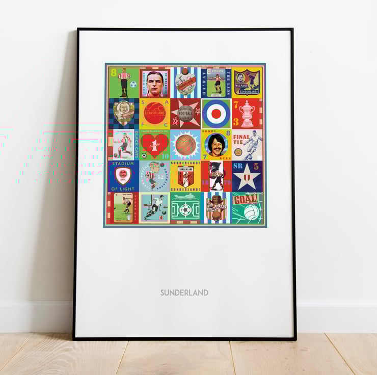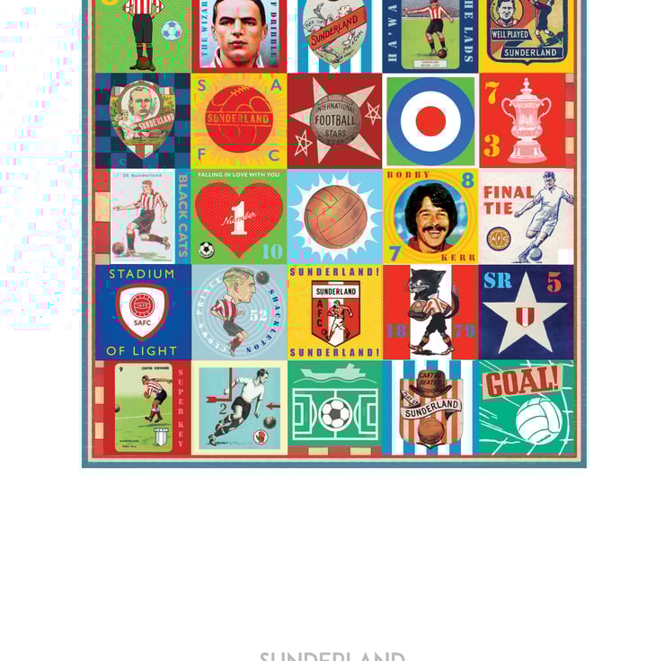 Celebrate the proud history of Sunderland with this unique Pop Art Print, featuring vintage images & memorabilia capturing and celebrating the rich heritage, history and Club legends. This print is the perfect tribute for any true Sunderlandl supporter.
