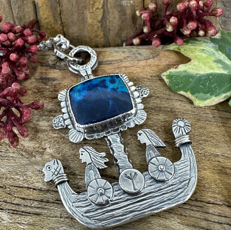 Inspired by my love of all things Viking! A Viking Ship pendant with azurite cabochon set in the sail.