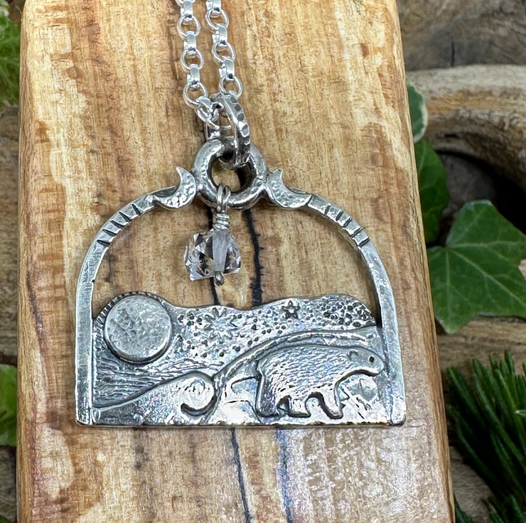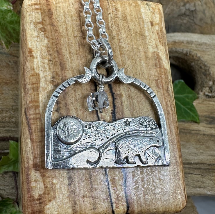 Inspired by my love of nature and wildlife. A polar bear picture pendant made using traditional jewellery making techniques in sterling silver. I have added a quartz bead to add a little icy sparkle. Oxidised finish.