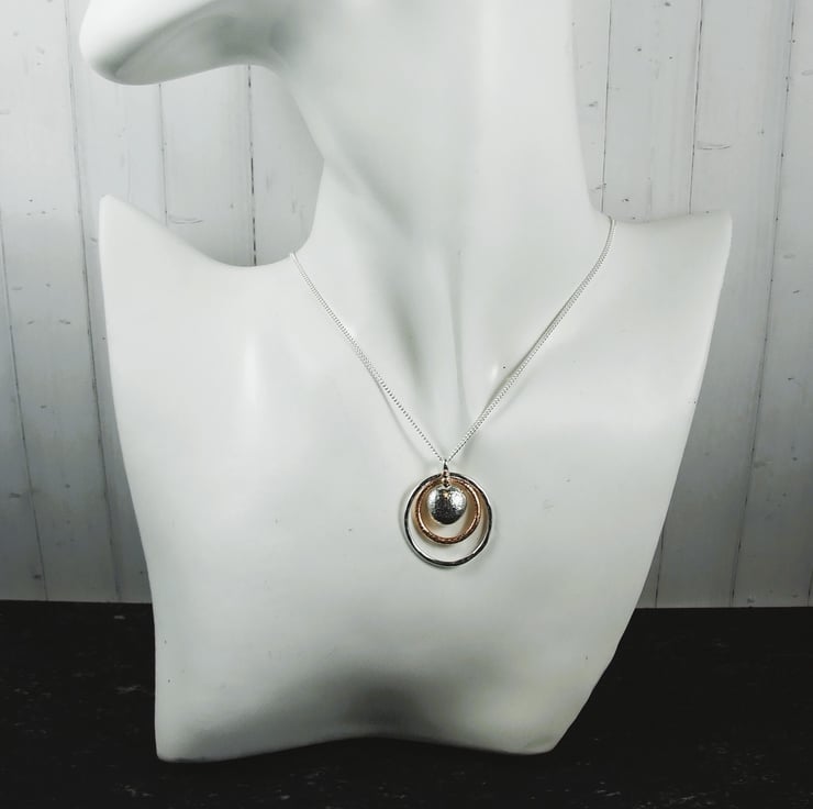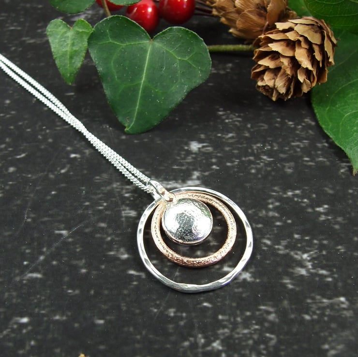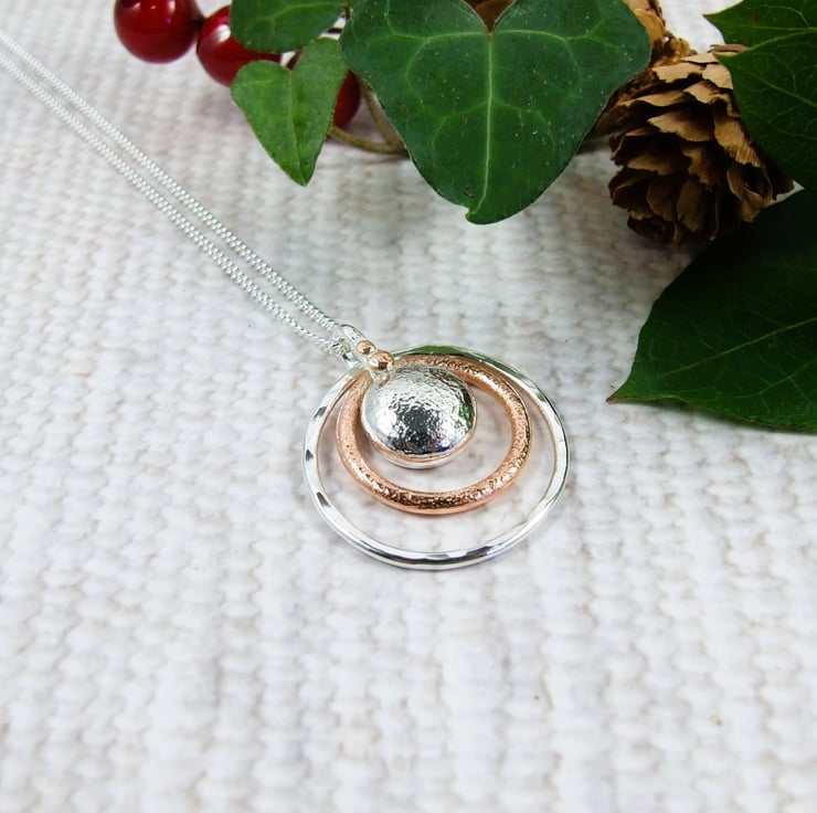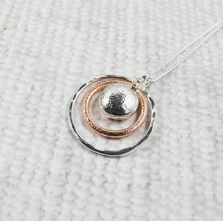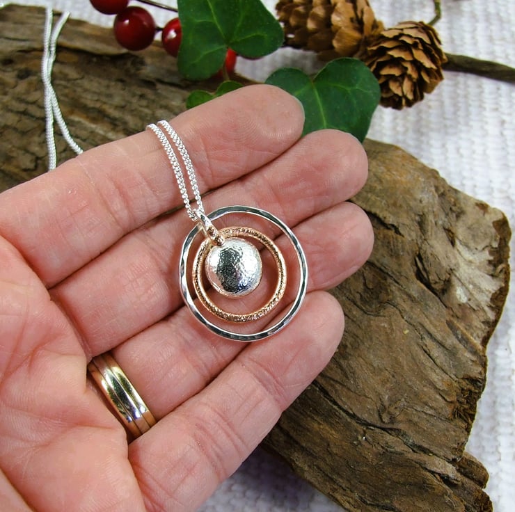 I have made the circles using sterling silver wire and copper wire, formed by hand and soldered, textured with a hammer. The pebble is formed by heating silver to melting point where it forms a natural pebble shape. I then creating the bail with silver wire and soldered all together leaving one of the circles to move around freely. Fitted to an 18 inch .925 Sterling Silver Chain.