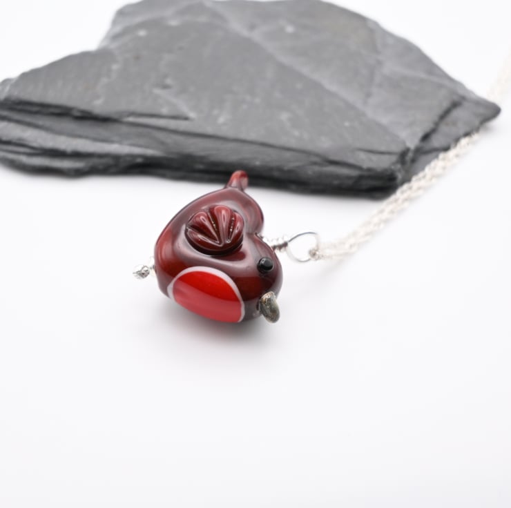 A sterling silver chain which features a handmade lampwork glass robin pendant.
