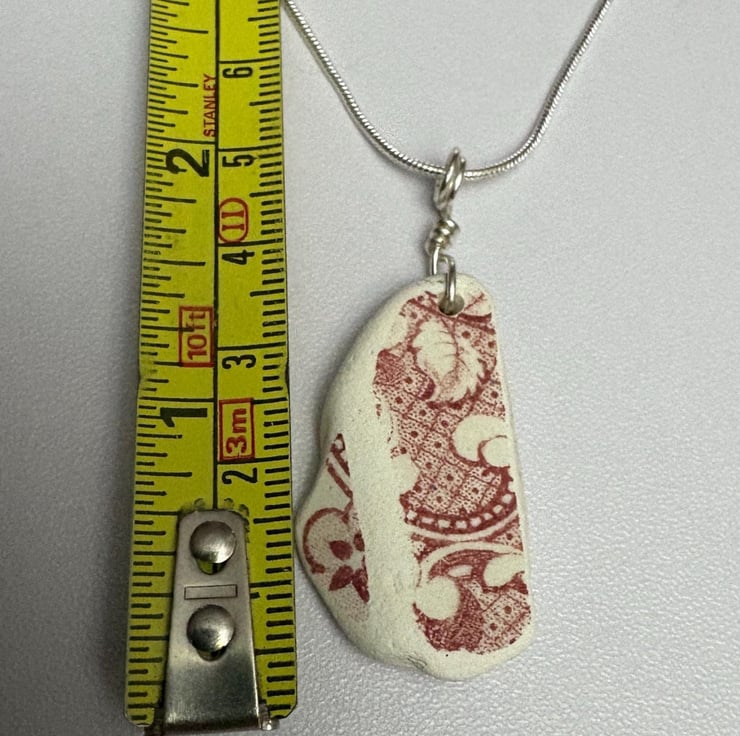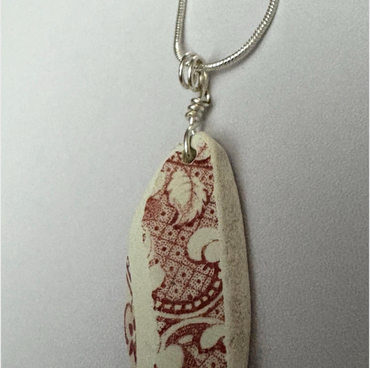 Lovely piece of sea pottery with red & white design. This is a large statement piece of jewellery that will finish off many an outfit!