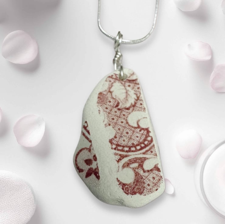 Sea pottery necklace. Red heart floral design, beautifully smooth piece.