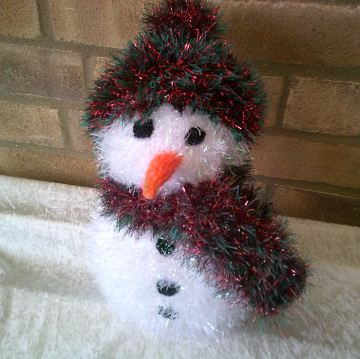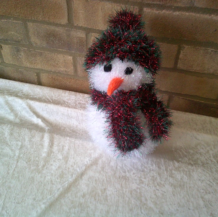 This cheery snowman is made using Tinsel chunky yarn in sparkly white and has a red and green hat and red and green scarf all made using the same yarn. He even has a wonky carrot nose and sparkly black buttons and eyes.