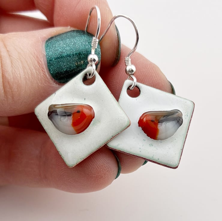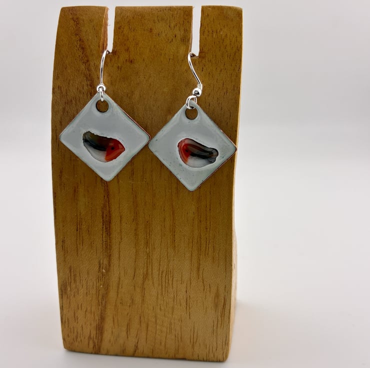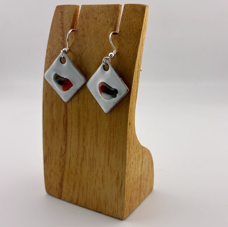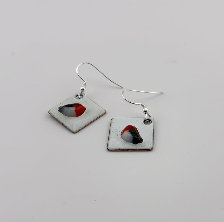 Using my kiln I have created these handmade dangly earrings featuring cute robins from copper squares which have then had layers of speckled white enamel added to the front before a glass robin was fused to it in the kiln.