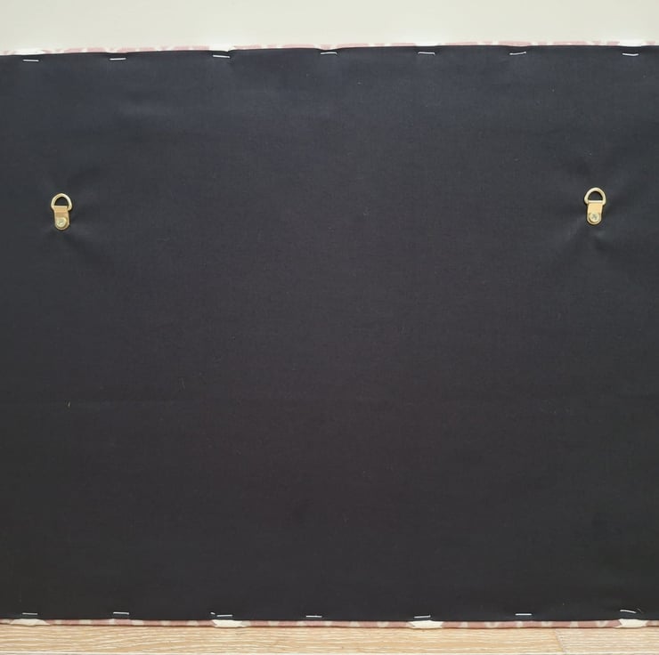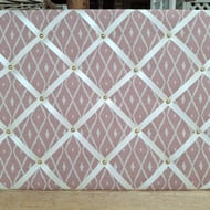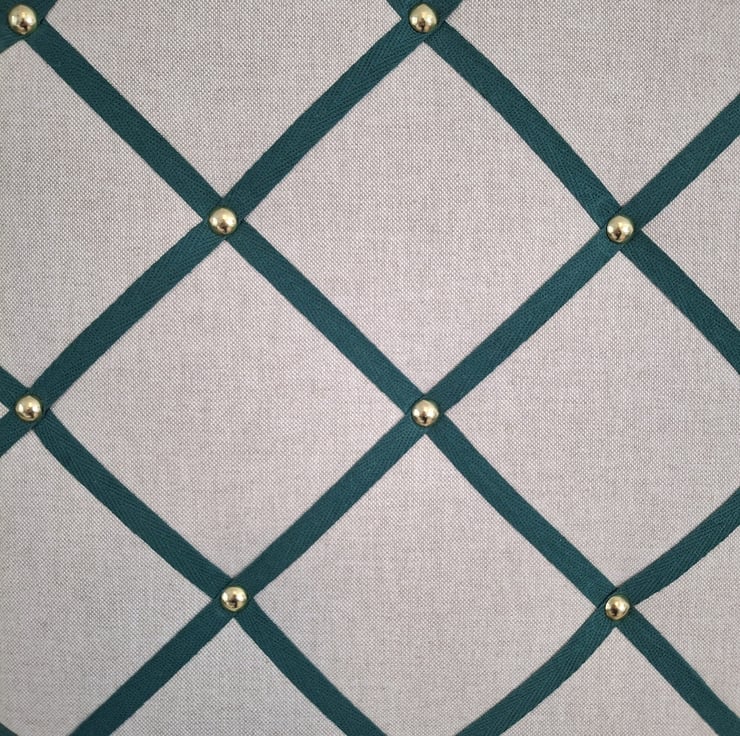Hand made notice board with natural cotton covering, green braid and gold studs. Padded for a fuller look.