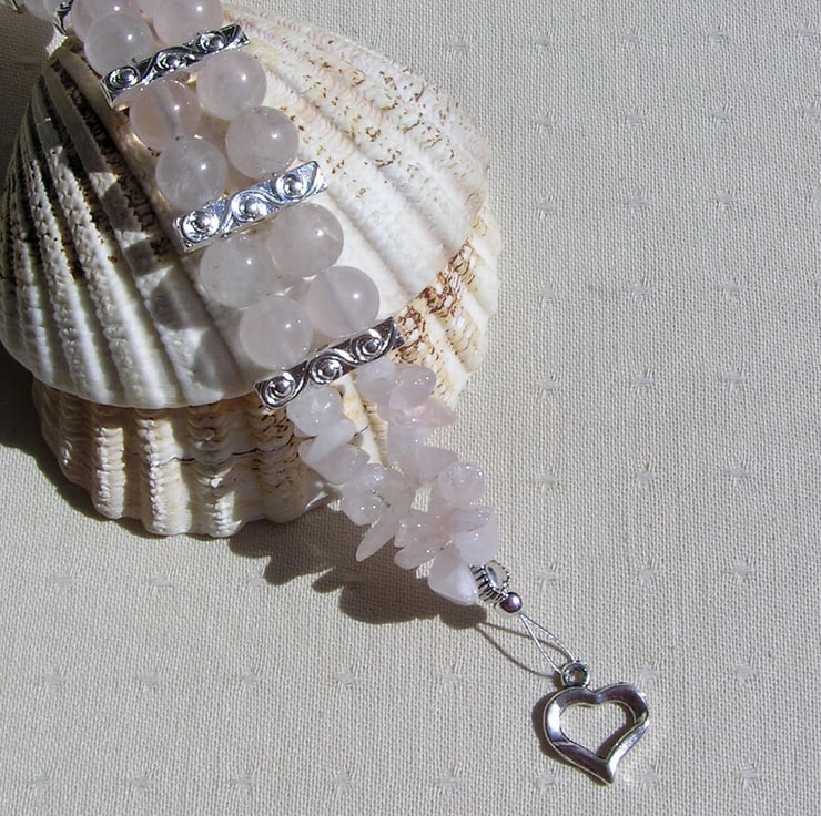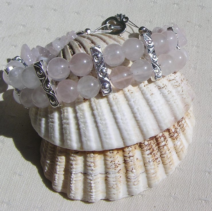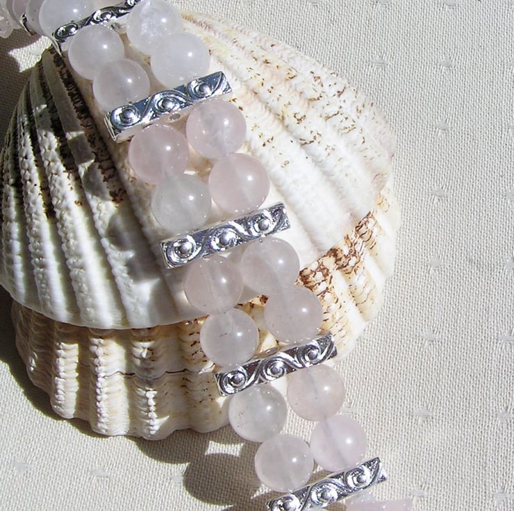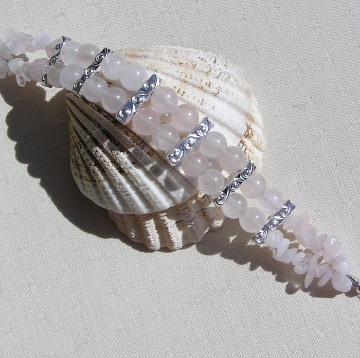 This Stunning Bracelet is made wholly from Rose Quartz... round beads & Gem-chips… each section separated by an ornately decorated Tibetan Silver Bar Spacer with a tiny Silver Heart at each end - a Beautiful Romantic combination that will look stunning either worn casually or with something more Elegant for a Special Evening out