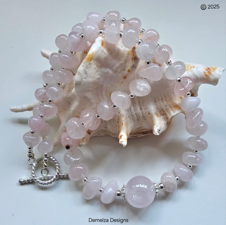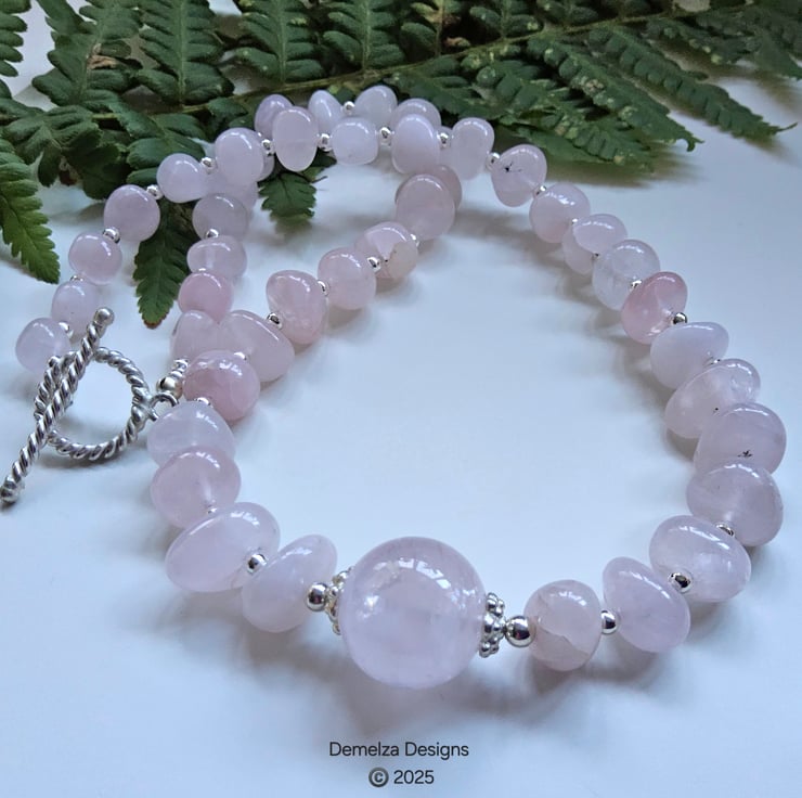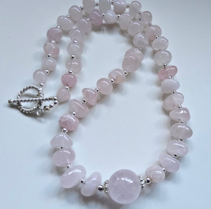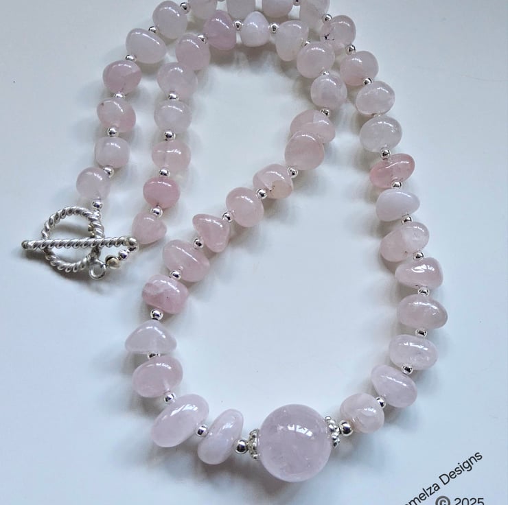This rose quartz necklace has been designed and hand crafted in Cornwall using one large rose quartz round with smooth tumbled pebble cut rose quartz. In the necklace centre is a large 2mm rose quartz with decorative beads caps and 4mm silver plated beads. Following on are free sized smooth tumbled rose quartz nuggets measuring 13mm x 8mm approximately. Between the nuggets are 3mm quality silver plated spacer beads.