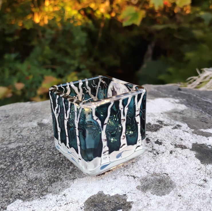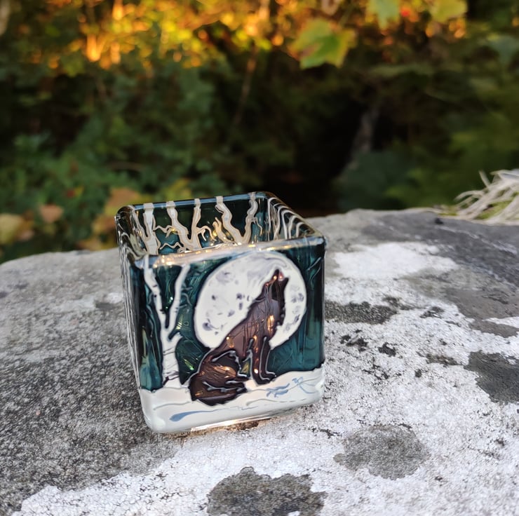 Wee glass candle holder, 5cm x 5cm, hand painted depicting a grey wolf under a starry sky with a full moon.