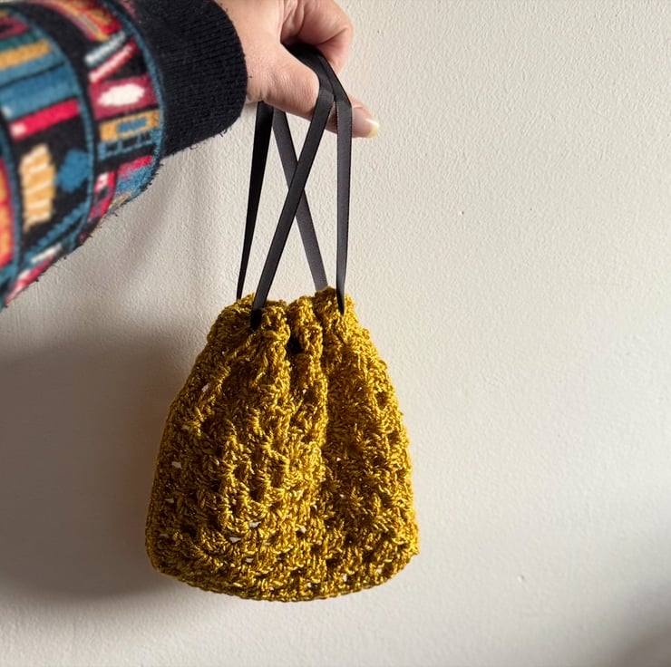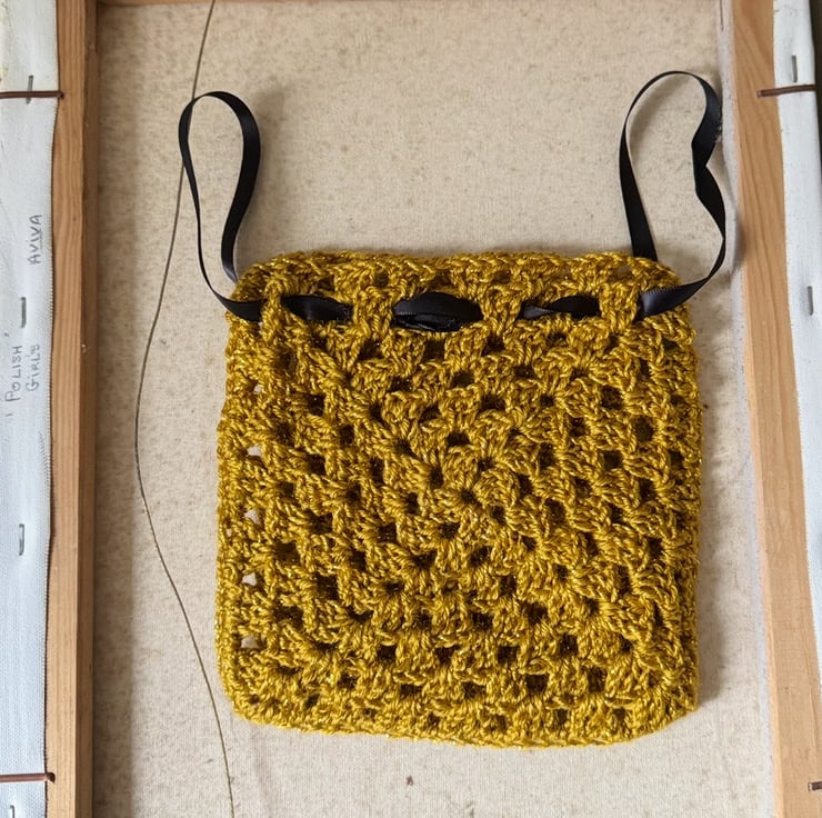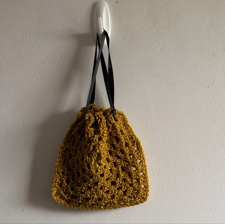 The photos don’t capture the sparkle of this crochet bag. The yarn is a rich gold colour with metallic flecks that twinkle in the light.