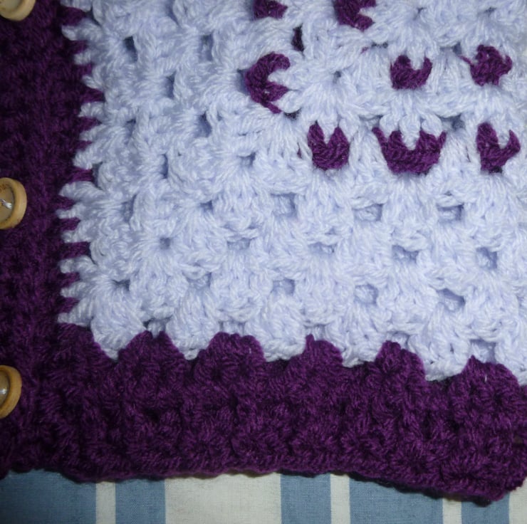 this is a hand crocheted toddler cardigan. created using quality acrylic yarn in purple and pale mauve.