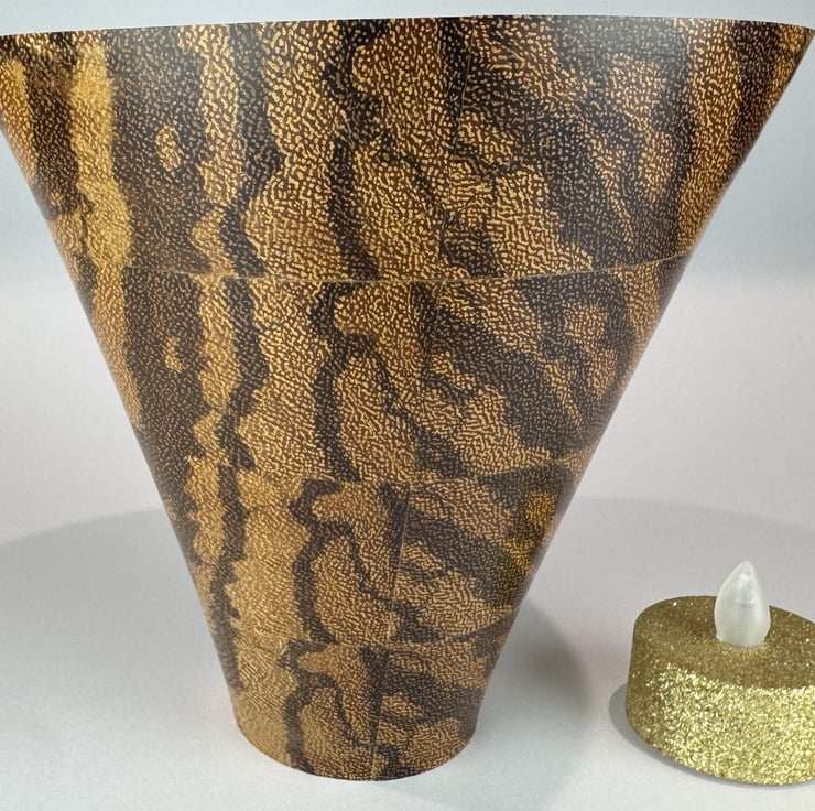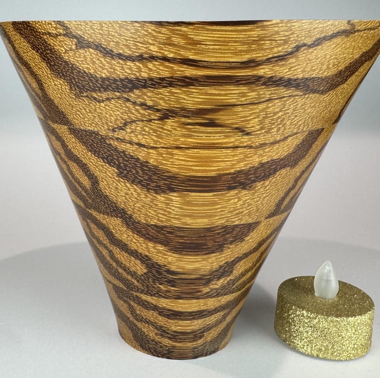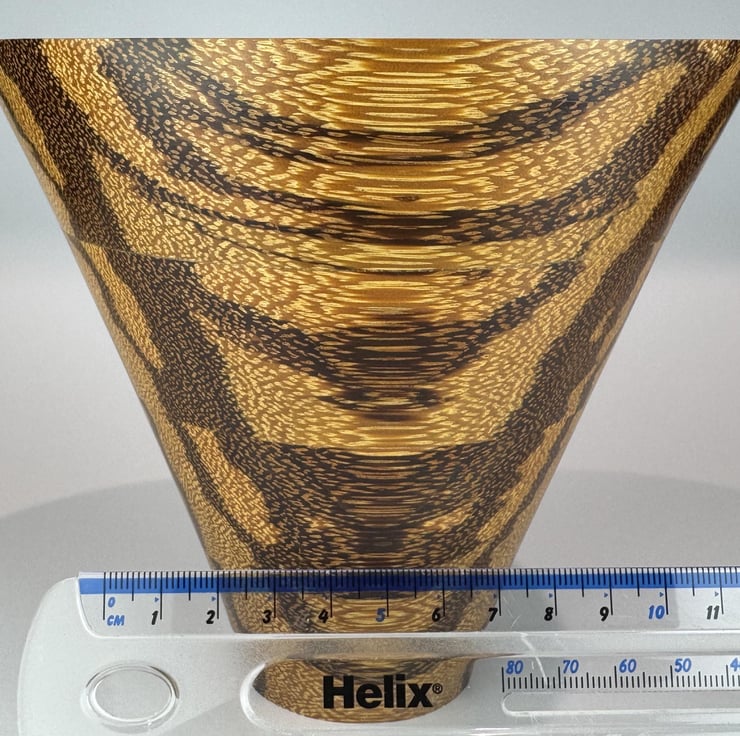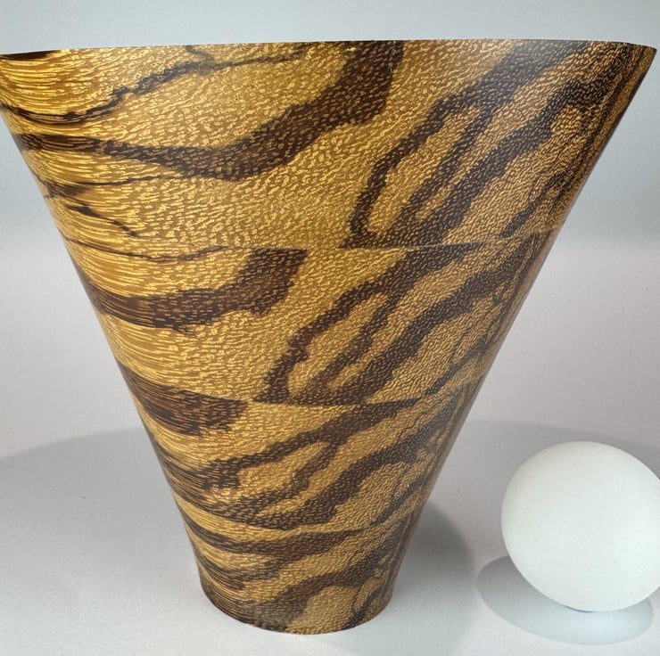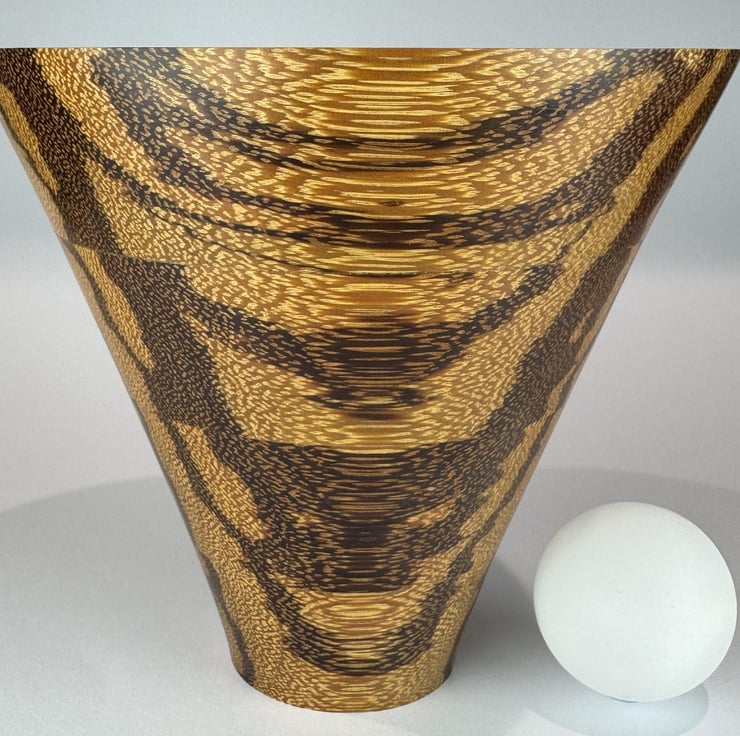 This Bowl is laminated from strips of Serpent Wood assembled in such way as to create this most attractive irregular pattern, looking very different as you view it from different directions. All the colours are coming from the natural wood.