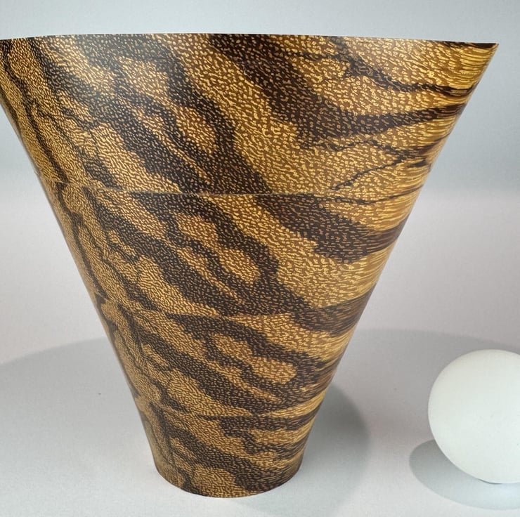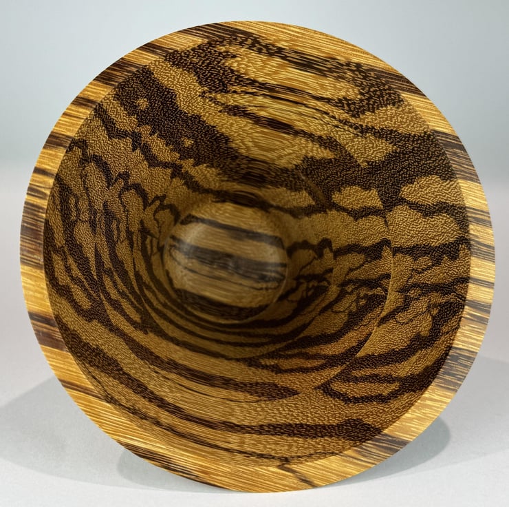 A really stunning, one of a kind bowl whether viewed from above or from the side. The simplicity of the curves shows off the natural beauty of the woods used.
