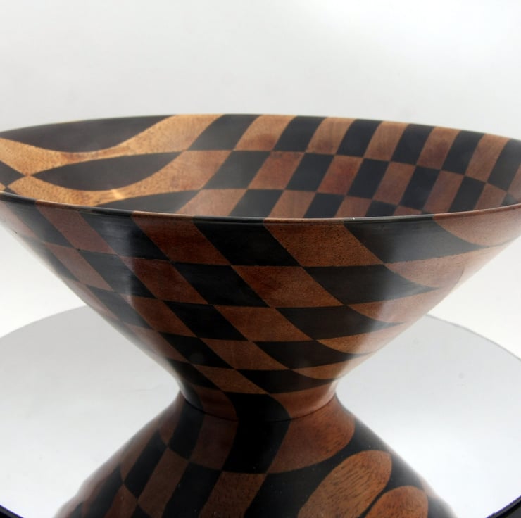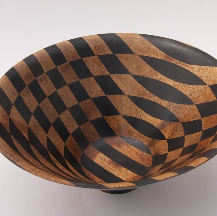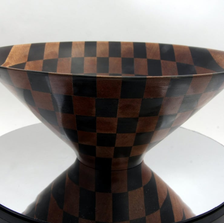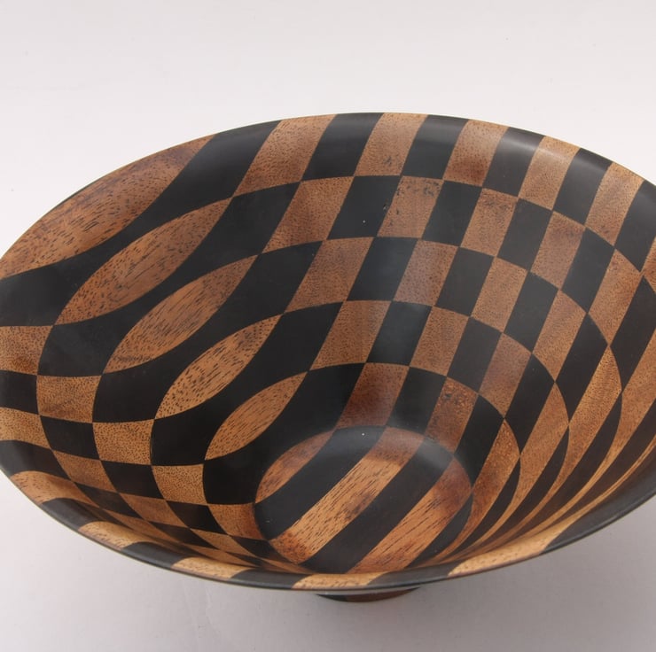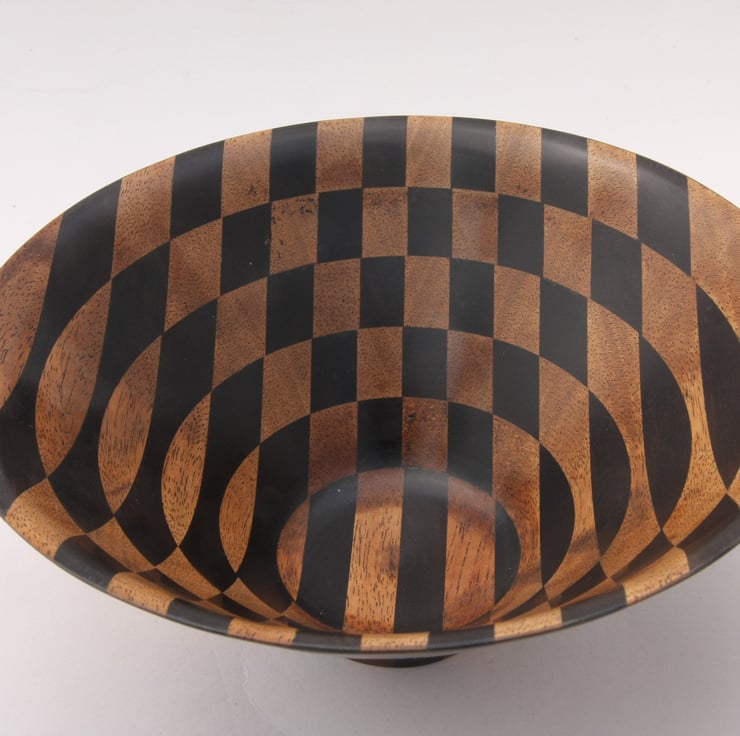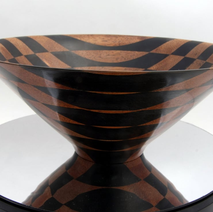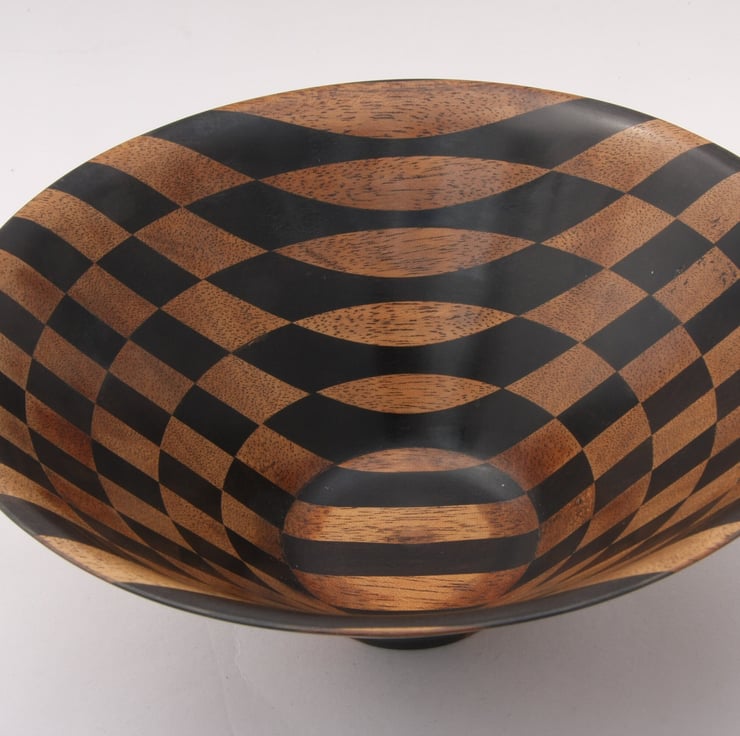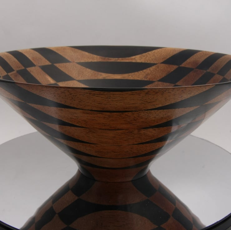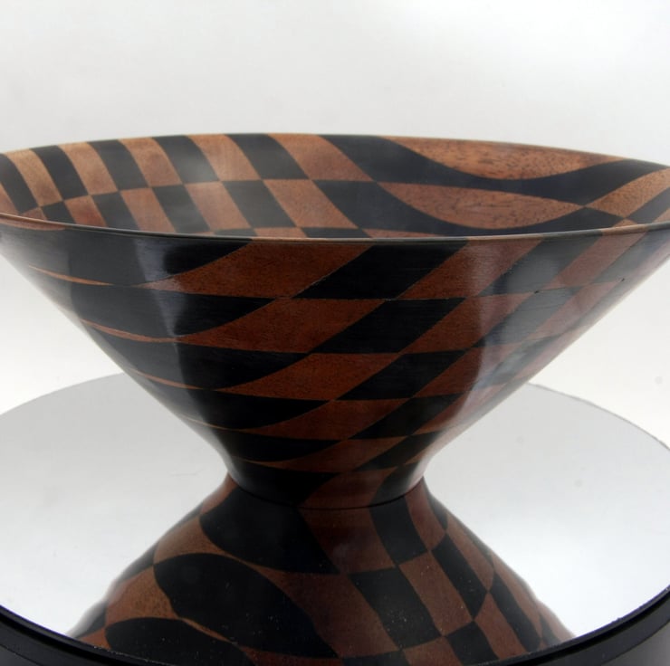 This Bowl is laminated from strips of Mahogany and Ebony assembled to create this very attractive geometric pattern, looking very different as you view around it. Curves one way and rectangles the other. All the colours are coming from the natural wood.