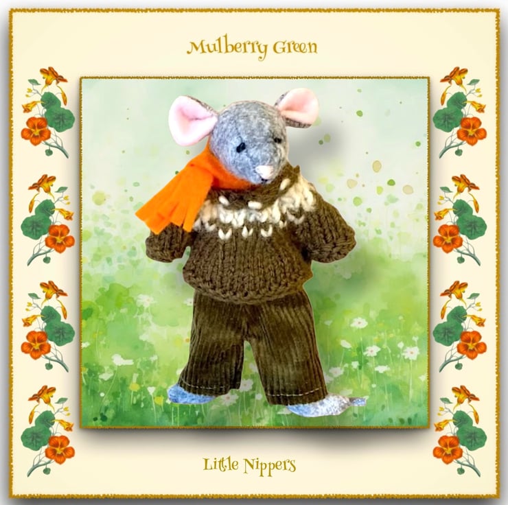 Jacob Hawthorn, in his hazelnut brown corduroy trousers, Green, brown and cream yoked jumper and orange scarf, is a Little Nipper. Little Nippers are tiny wood mice who live in a maze of tunnels underneath the barn at Mulberry Farm. All of the Little Nippers are named after herbs and meadow flowers. Pip Squeaks are 11cm tall. Clothes made especially to fit them are also available in my shop.
