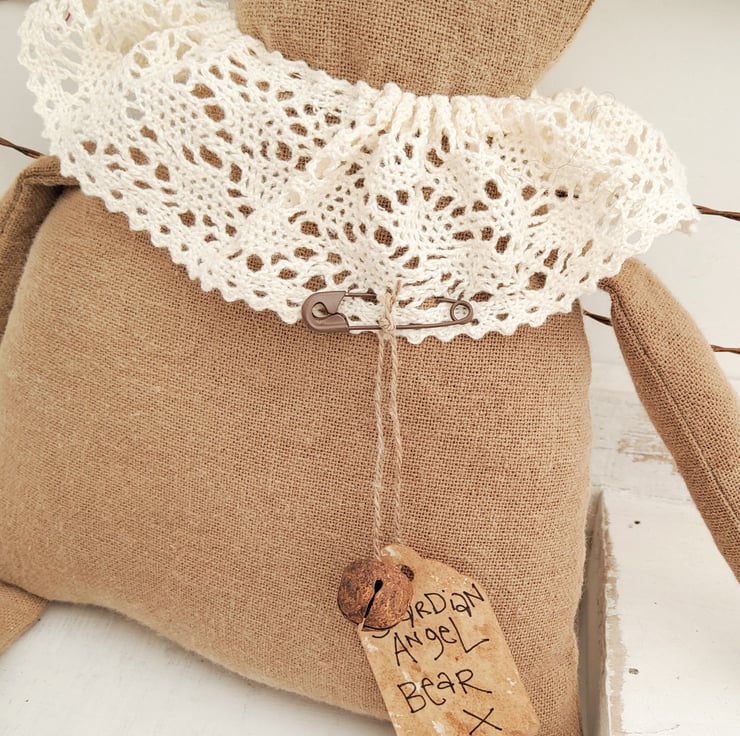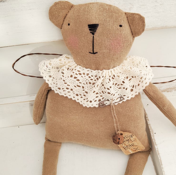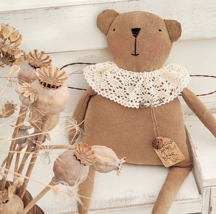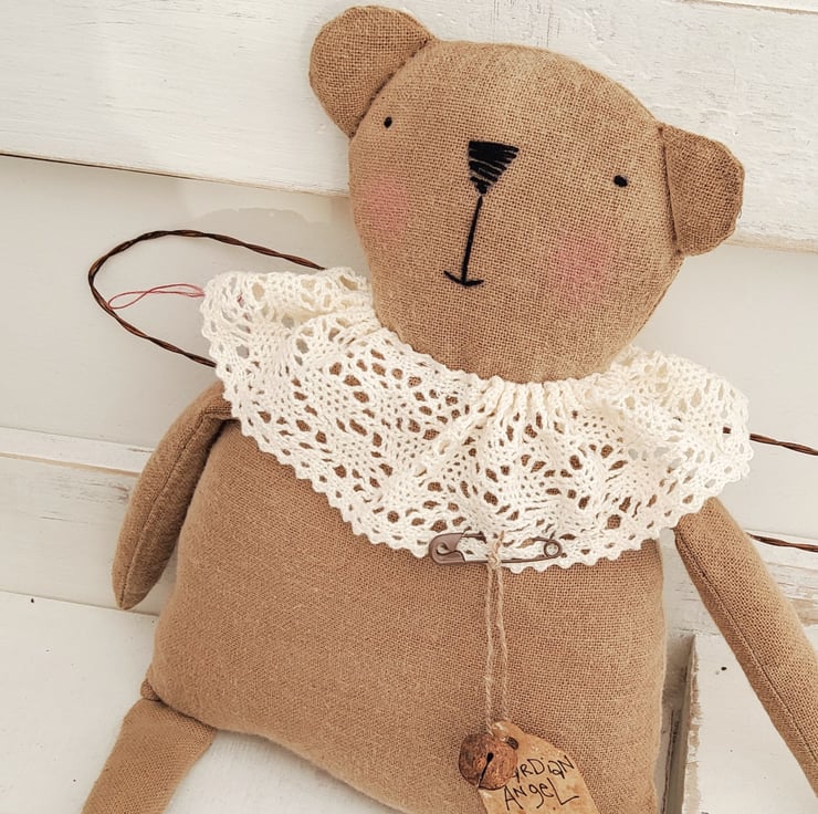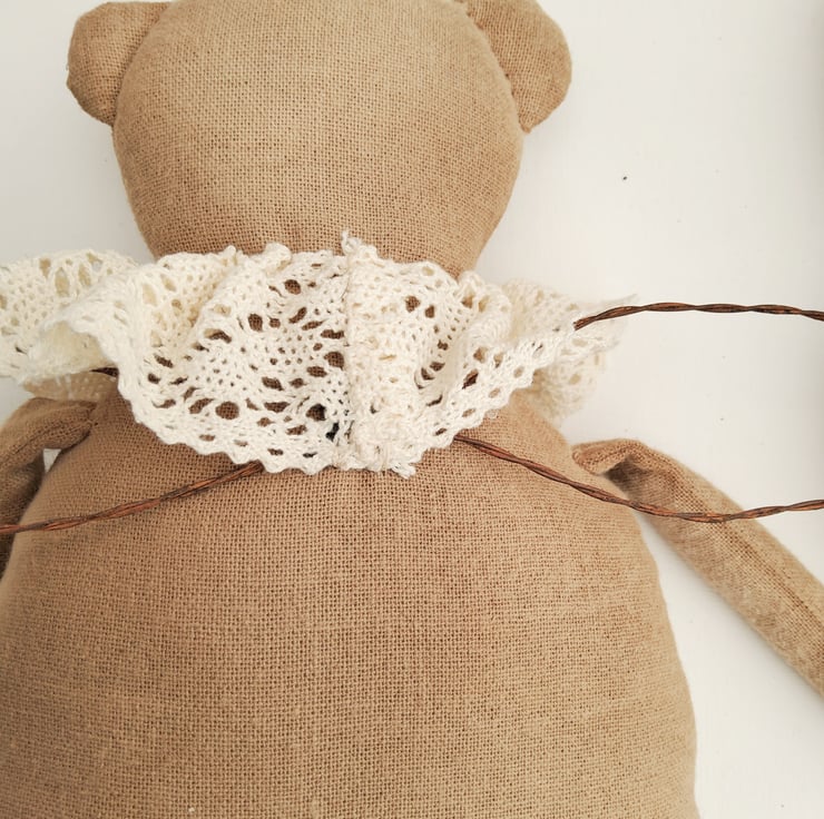 Guardian Angel bear ( featured a few years ago in Mollie Makes - i was soo pleased )!! is made from coffee dyed Osnaburg fabric, then sanded for a care worn look. The features are embroidered and the neck ruff is vintage lace. The wings are made from rusty wire.