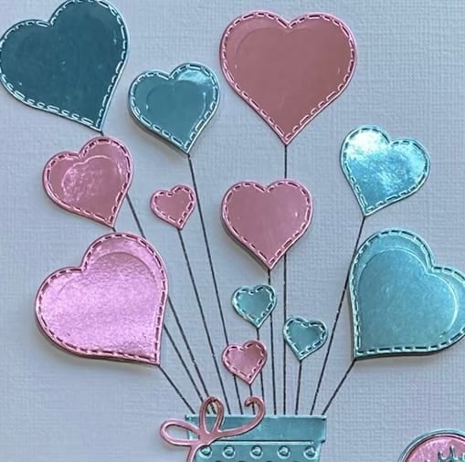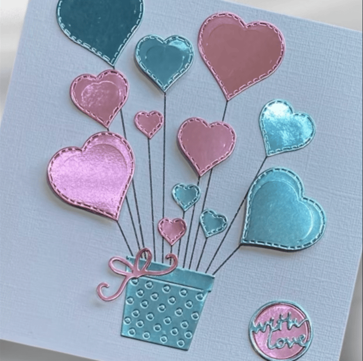 Each card features a white linen base layered with twelve pink and blue die-cut mirror hearts, some raised in delicate 3D for added dimension and charm. The hearts appear to bloom from a decorative vase, with the sentiment “With Love” carefully added to complete the design.