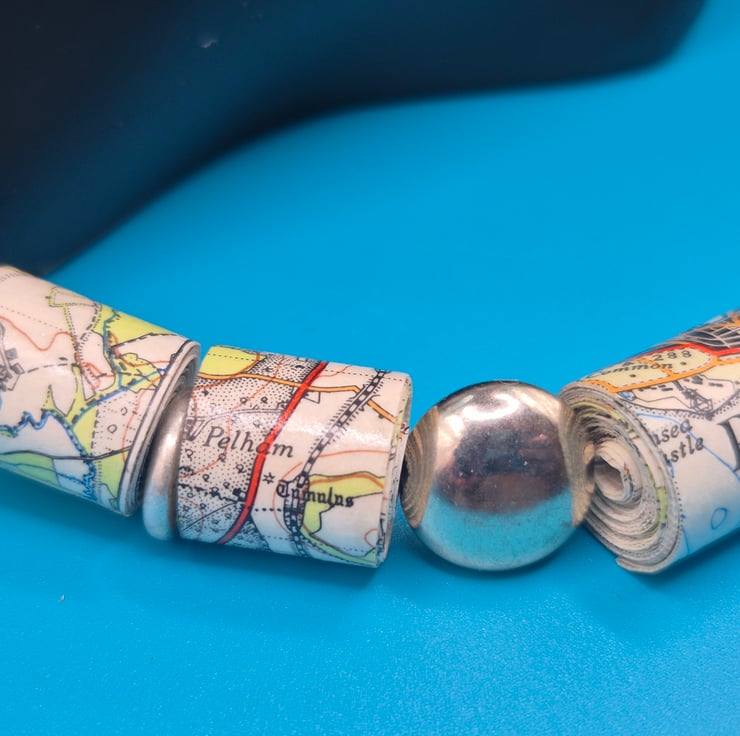 The old Ordnance Survey map of Chichester was cut into strips which were rolled into tubular beads then varnished. The paper beads were complemented with silvery metallic beads and rondelles. The longer central bead says "Portsmouth".