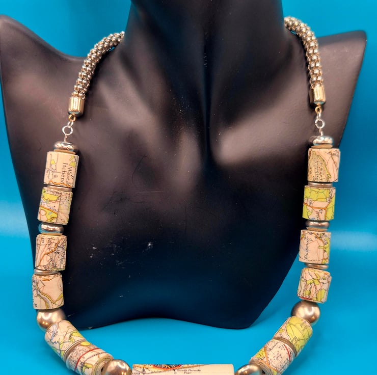 A light and unusual necklace made of a recycled old map and of pre-loved silvery discs.