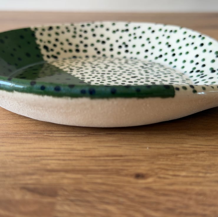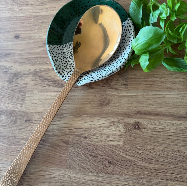 Handmade Ceramic Spoon Rest – Green & Black Dots