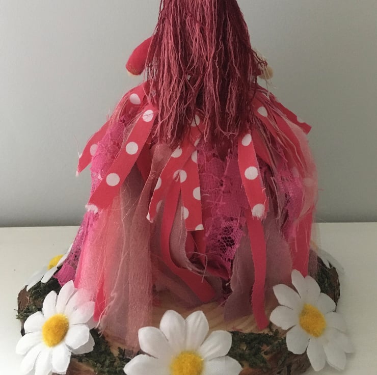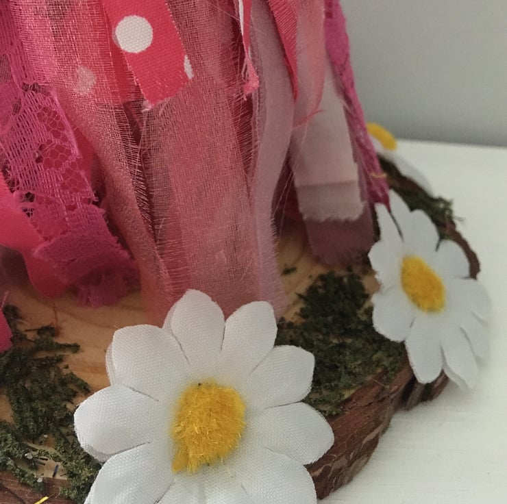 A range of scrap, upcycled fabric, cut into strips with raw edges is used to create a multicoloured pink skirt. Upcycled material from clothes is used to create the top. This little fairy person has a necklace and headband made from tiny beads and shoes made of shiny beads.