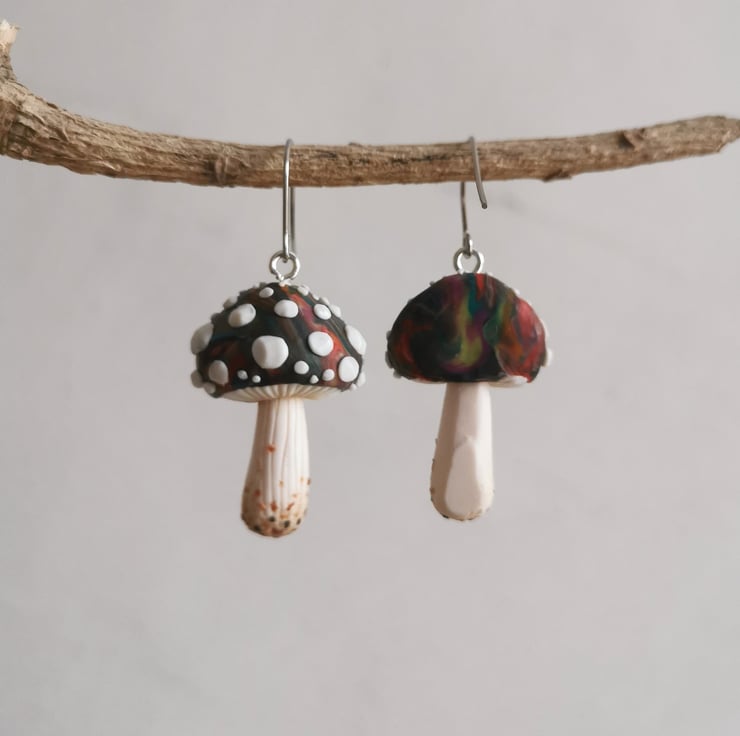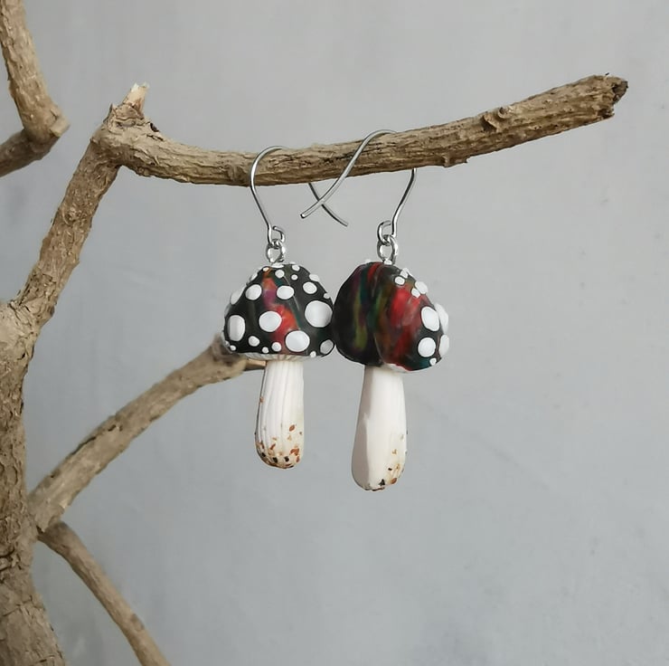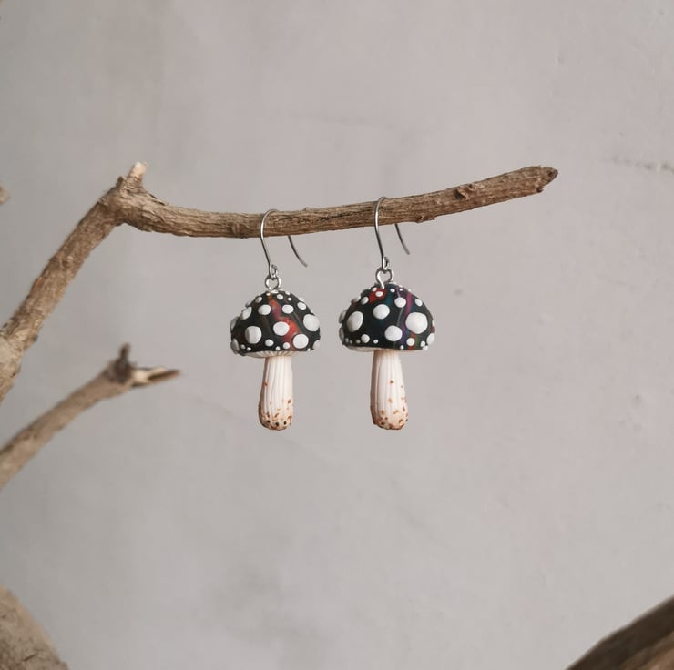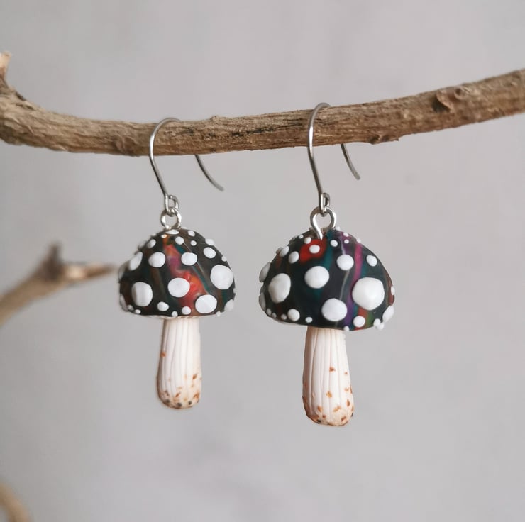 Stylised dark colourful mushroom earrings for someone who wants something a little different from your standard red. Something a bit spacey.