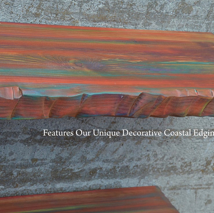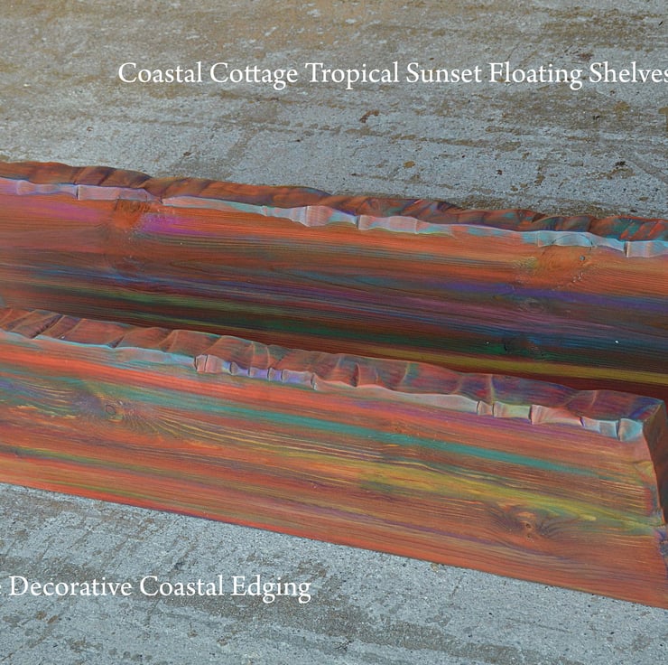 Perfect for coastal cottage lovers or anyone seeking a vibrant, handcrafted storage solution for their bathroom, entryway, or living room. These tropical sunset shelves are ideal for extra storage. Hand painted in a unique old boat wood style finish that adds art to your furniture. Unlike mass-produced shelving, this custom hand made piece is made-to-order so each one feels both one-of-a-kind as well as functional. A great conversation starter with your guests. Customers love the pride of owning artisan-made, personalized decor.