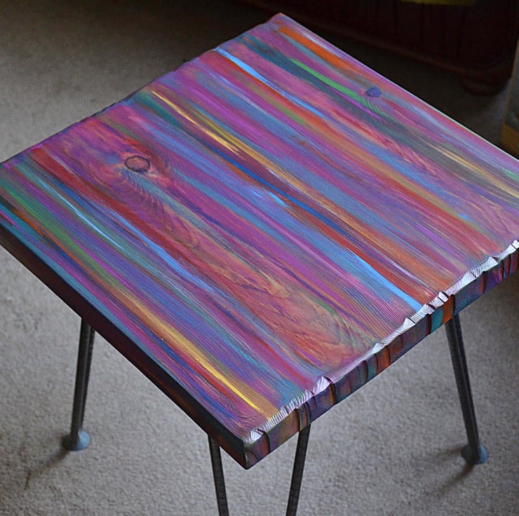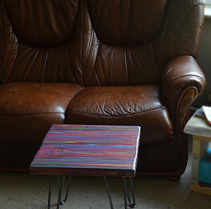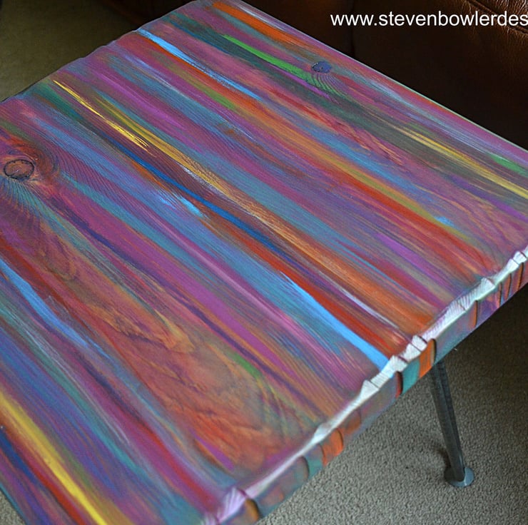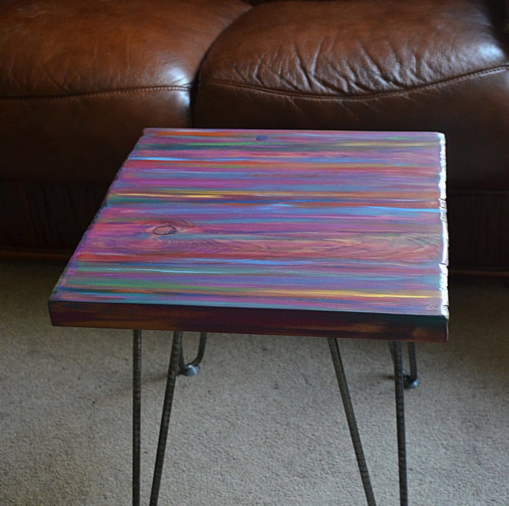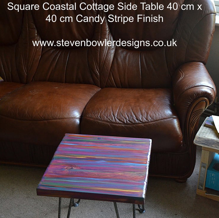 This sleek & stylish square solid wood table top is hand painted in a 'Decorative Old Boat Wood Style Finish' using a lovely rainbow wash of colorful candy stripe pinks, greens, blues and purples. Creates a colourful nautical feel to your decor. Comes with 4 contemporary sleek black metal hairpin legs which are easy to fix into place. Ideal little side table.