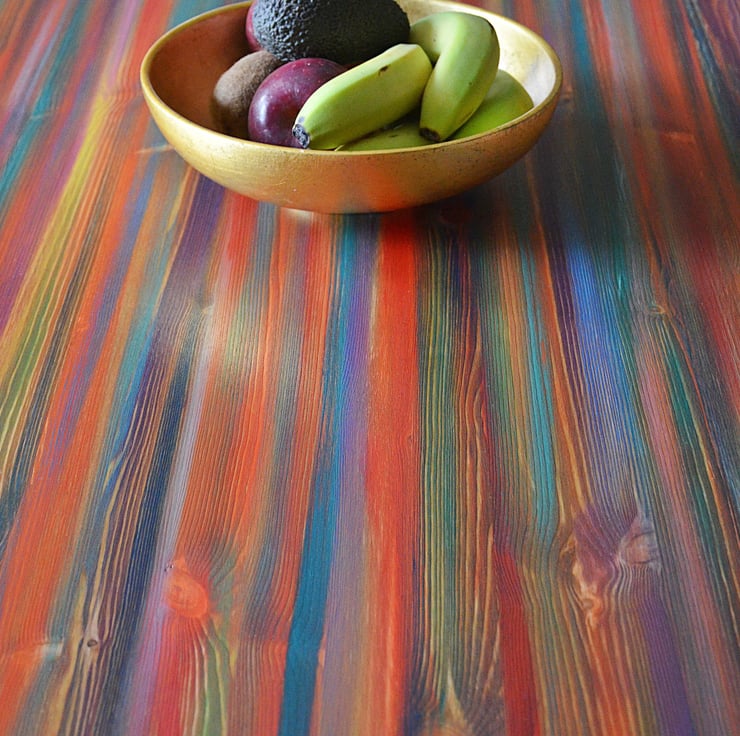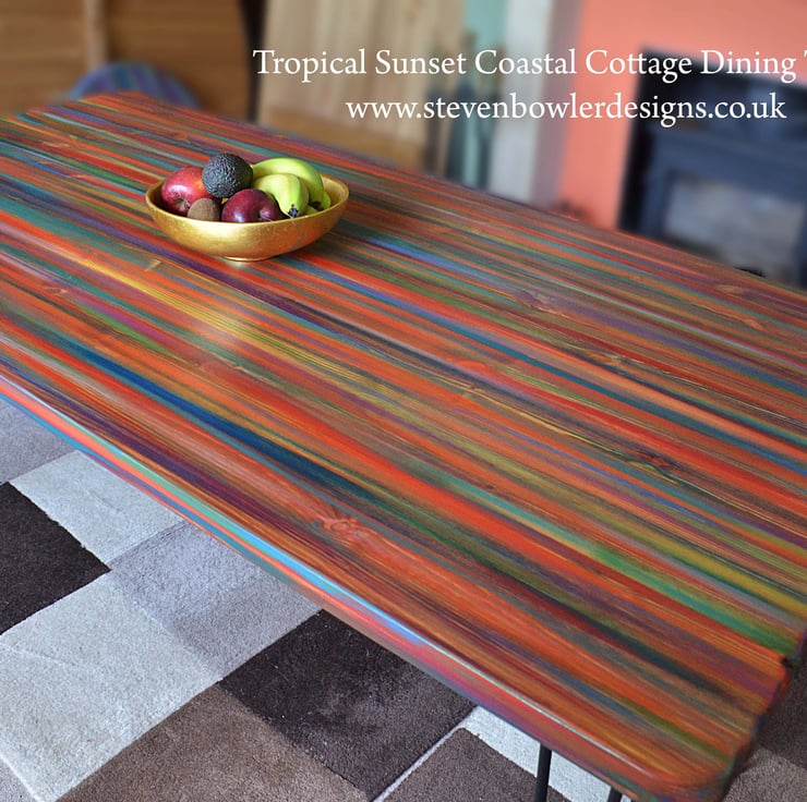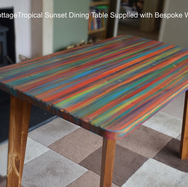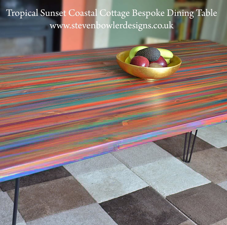 Our tropical sunset dining table is perfect for families, couples and everyone who want an artistic warm coastal vibe at their beach house, cottage, or modern farmhouse. Our one-of-a-kind hand-painted wood dining tables bring tropical sunset colours into your home, handcrafted for strength and style.