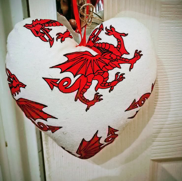 These unique Welsh Dragon stuffed hearts have been made with a printed cotton jersey and backed with a white cotton fabric.