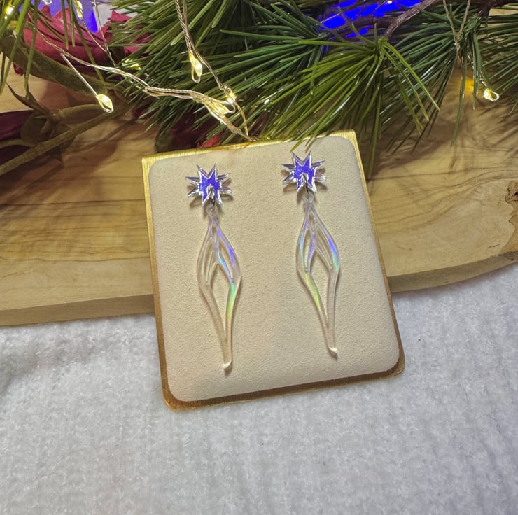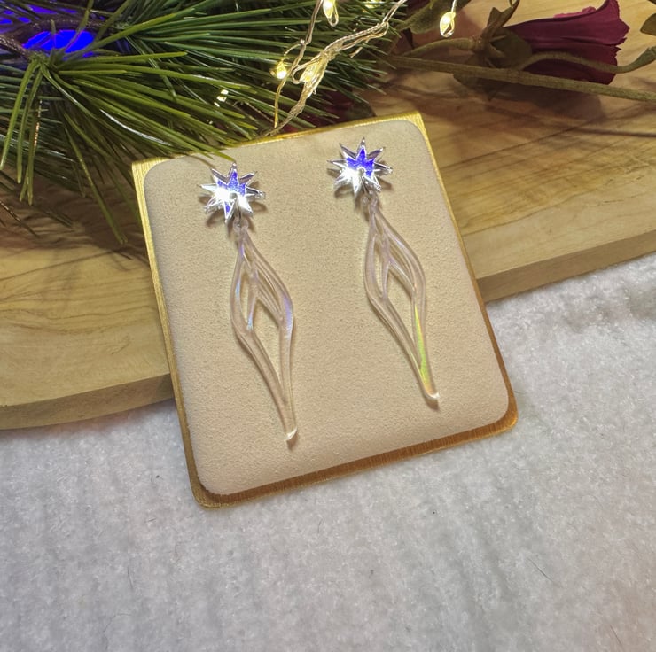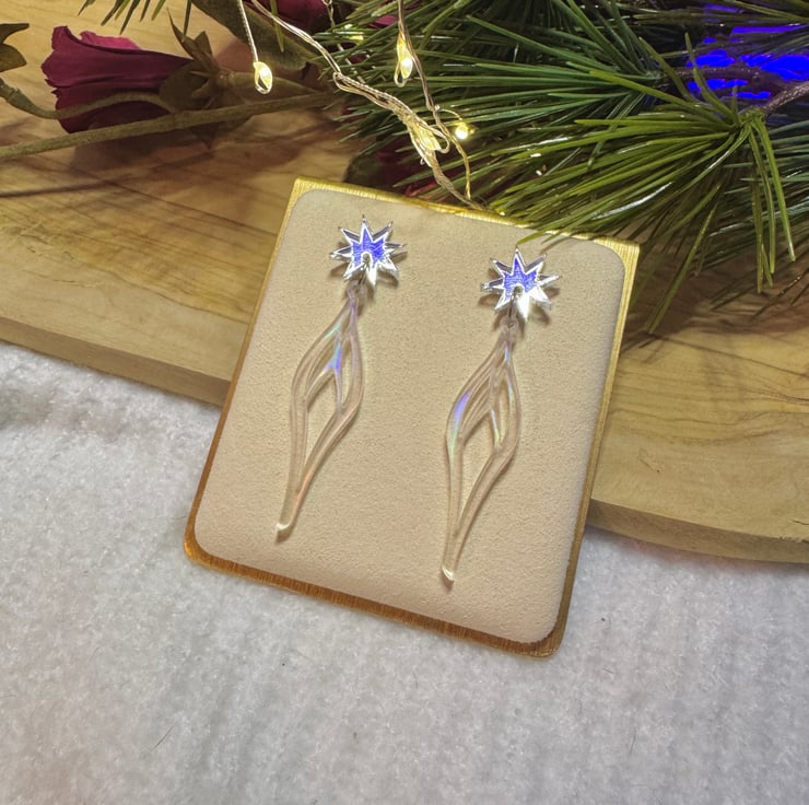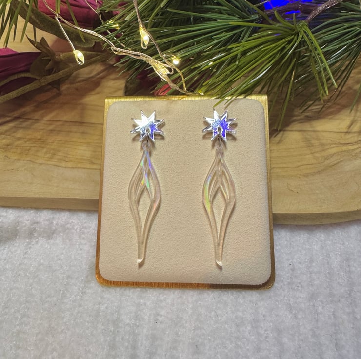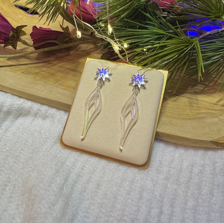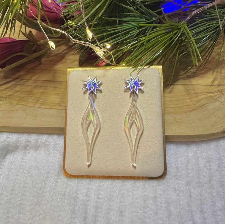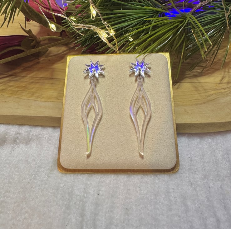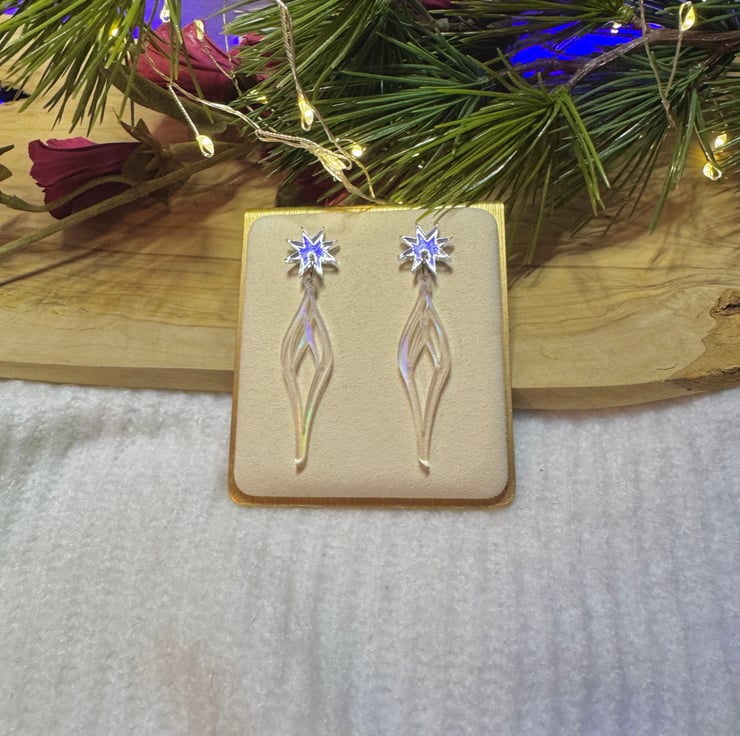 Attached to iridescent Holographic clear Acrylic cut into an elegant Icedrop shape.