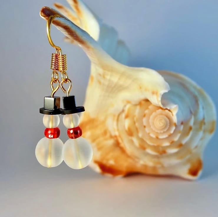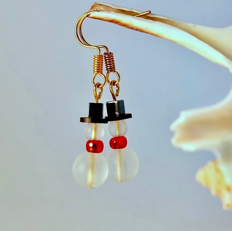 Each of these sweet little snowman earrings is made from frosted glass beads for the body and head, with a small, shiny red glass seed bead for a scarf and a hat made from a polymer clay disc topped with a cube of hematite.