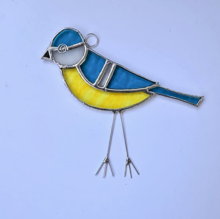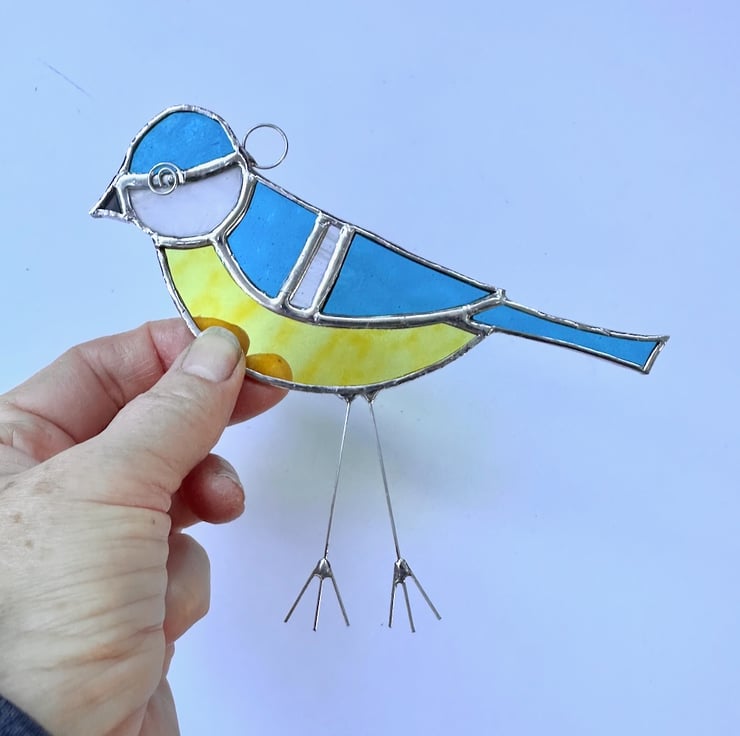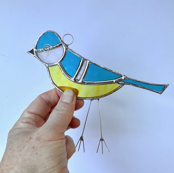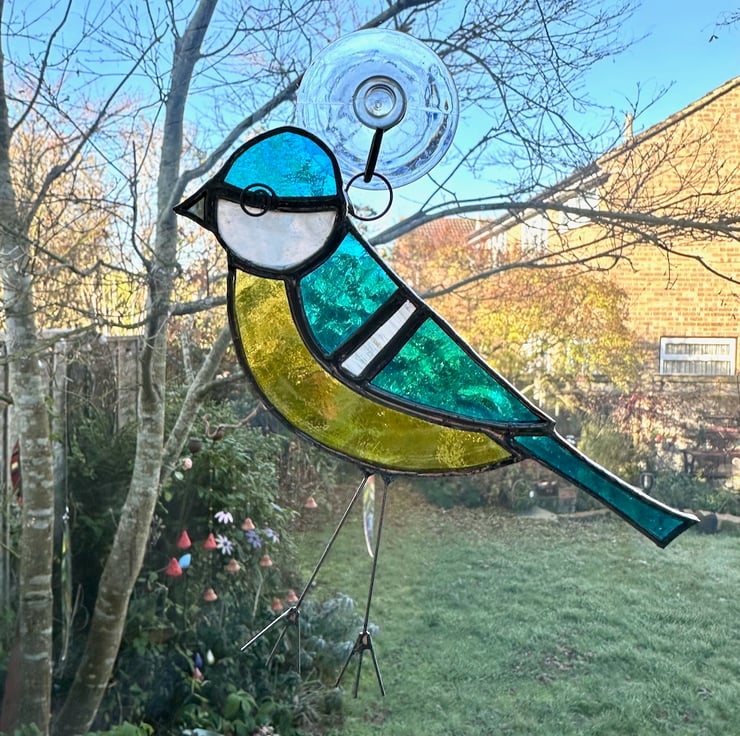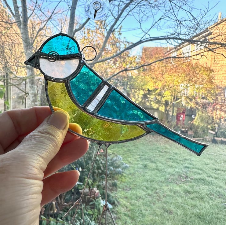 Blue tit suncatcher made from beautiful stained glass by Carole’s Glass.