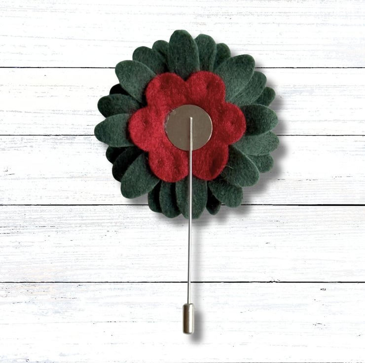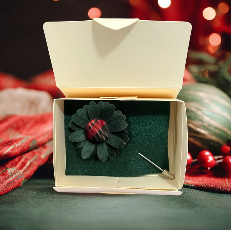 Featuring a beautiful tartan fabric-covered button in rich red and green tones, surrounded by soft green felt petals, this pin is perfect for adding character to jackets, coats, or bags.