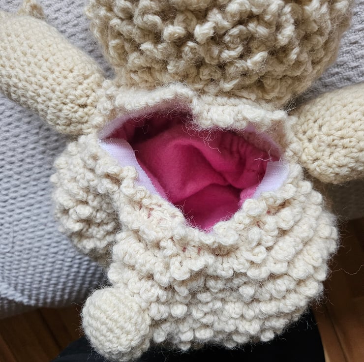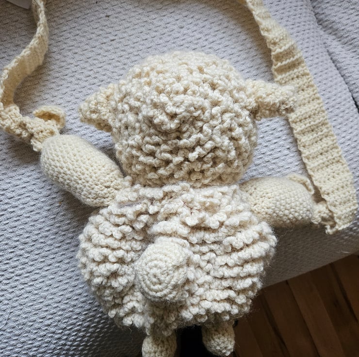 Meet Steve the sheep - a cuddly shoulder/cross body/handbag. Crocheted wool aran yarn with pink felt bag lining and velcro fastening. He's a cute fella!