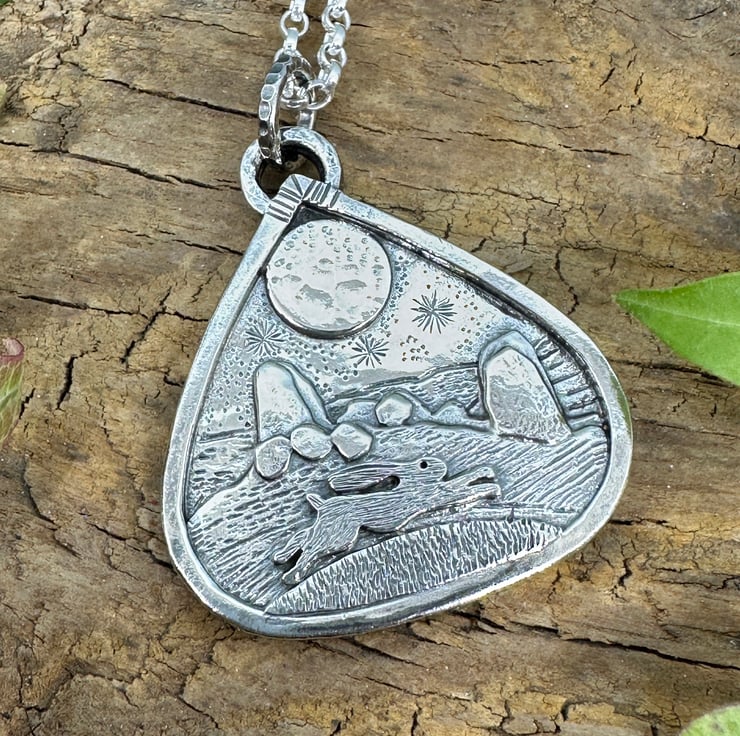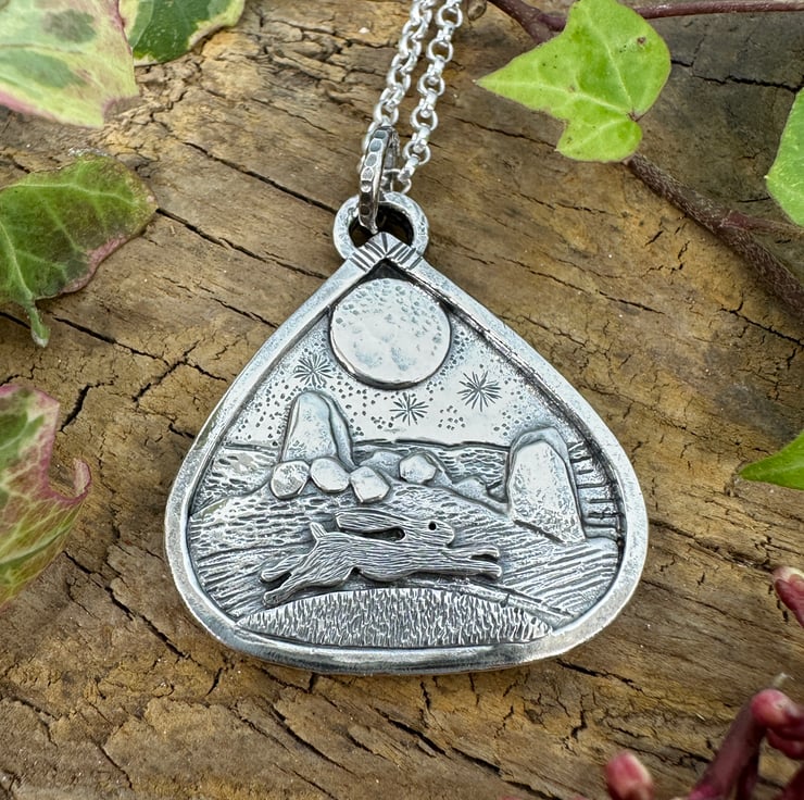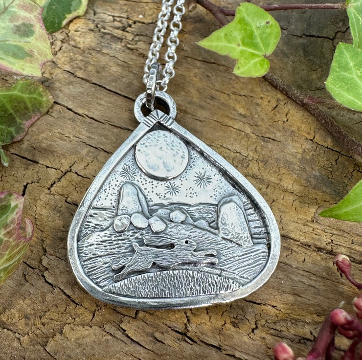 Inspired by my love of hares, mythology and our ancient landscapes. I have made this pendant in sterling silver using traditional jewellery making techniques.