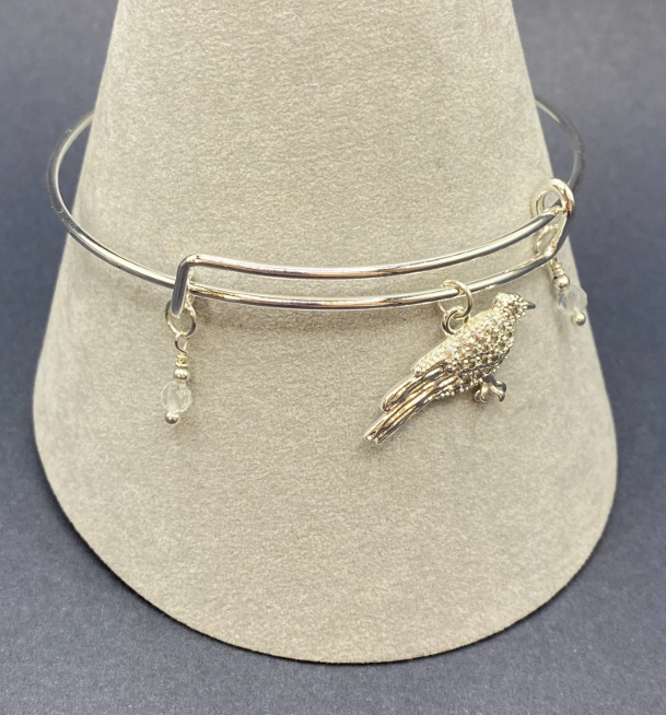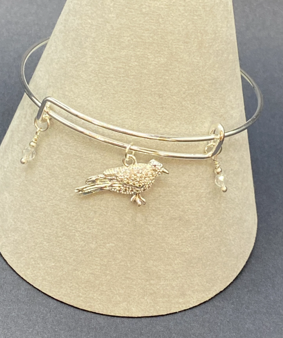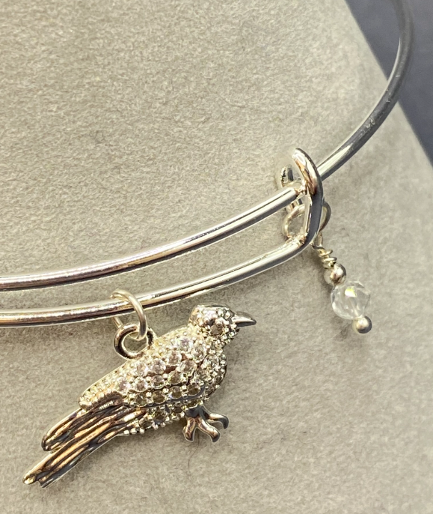 Silver plated bangle with a striking silver plated bird charm, surrounded on each side by a tiny sparkling white topaz stone.