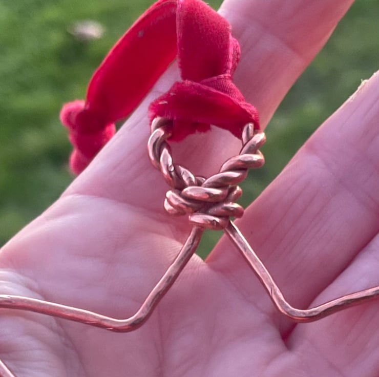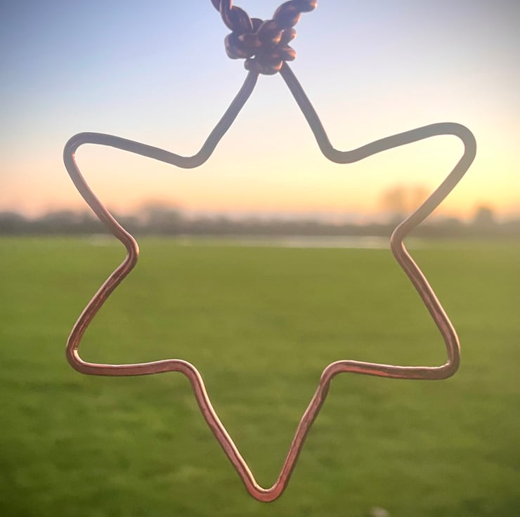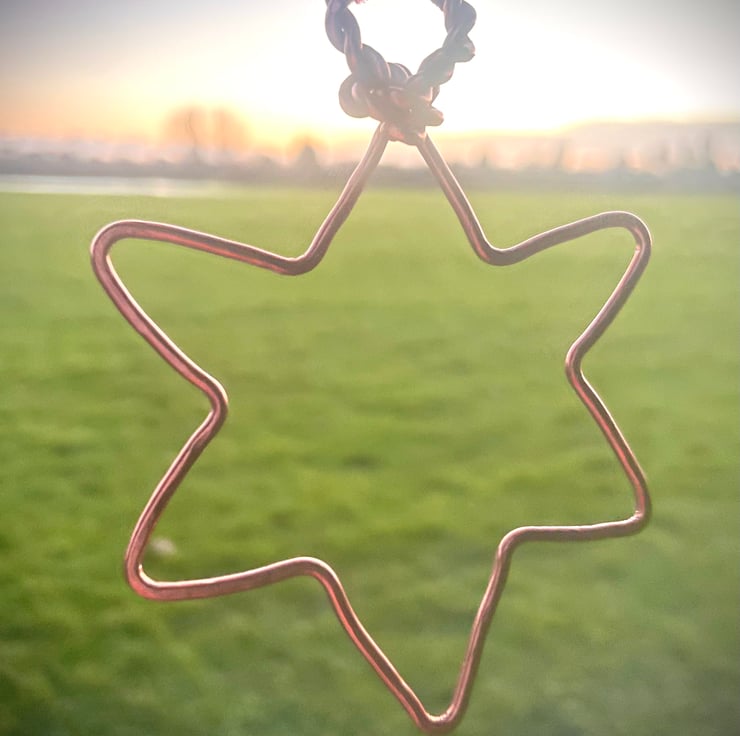 I have braided the copper wire and created a circle at the top of the star from which hangs a velvet ribbon. This six point star can be a Christmas decoration or a talisman to hang wherever suits you in your home.