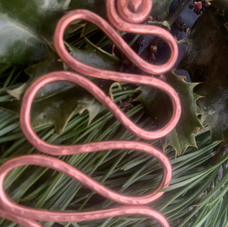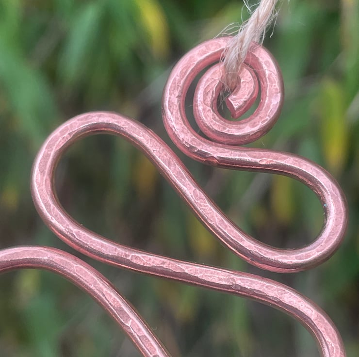 This copper wire ornament is a celebration of flow and form—each curve shaped by hand, each spiral hammered with intention. Suspended from a simple cord, it catches the light with a warm, earthy glow, echoing the movement of wind and water. Whether hung in a window, on a wall, or as part of a seasonal altar, it invites a sense of rhythm and quiet energy.