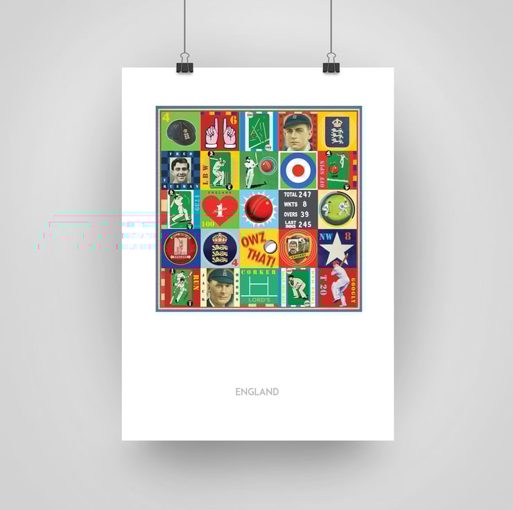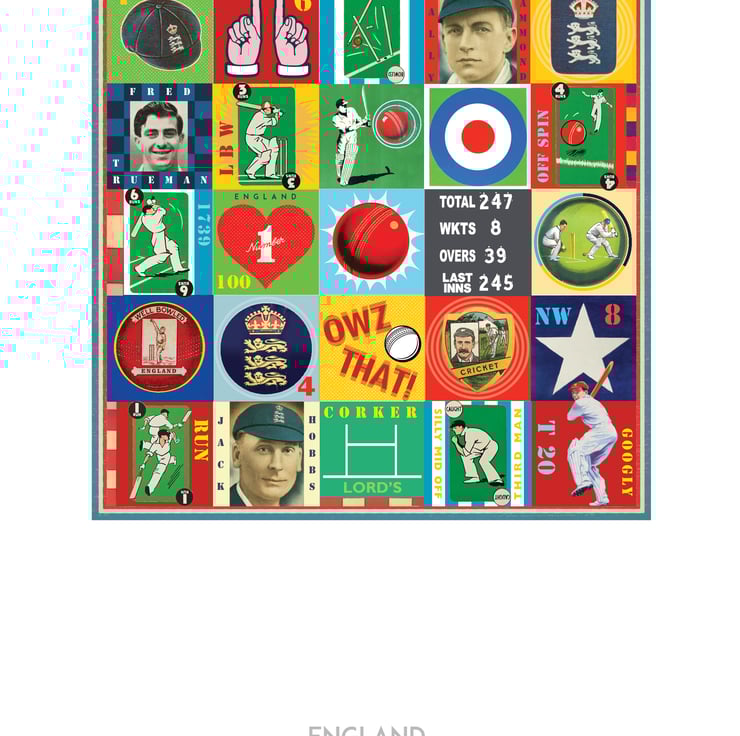 Celebrate the proud history of England Cricket Team with this unique Pop Art Print, featuring vintage images & memorabilia capturing and celebrating the rich heritage, history and Club legends. This print is the perfect tribute for any true England supporter.