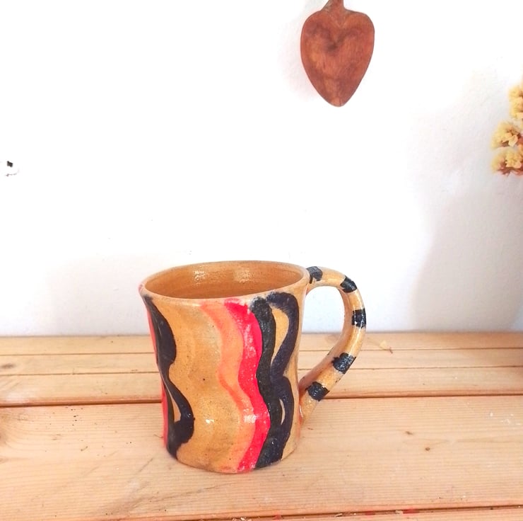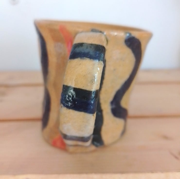 A "thrown" mug, deliberately altered to produce a quirky wonky unusual thing. Suits hot or cold drinks and beverages. Made from high quality stoneware clay, shorter on one side than the other, with an added handle. Decorated with random multicolored stripes. red, orange, dark blue, pale green etc. Finished in a glossy glaze. Dishwasher and microwave safe. Stands 7.4 cms one side 8.2 cms the other x 8 cms diameter rim with a capacity of 200 mls approximate. Keeps hot and cold drinks hotter and colder for longer.