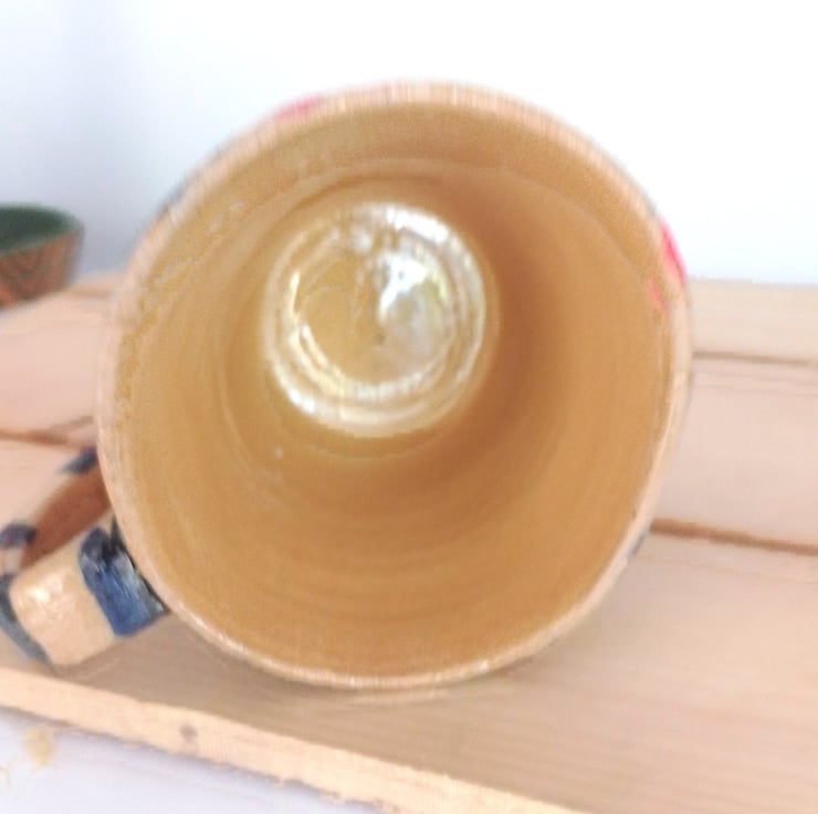 I have always been interested in producing one off original ceramic items. The idea came to me once, many years ago at a craft fair, but they were wonky mugs cut wrongly off the Potters wheel and were sold as seconds. To deliberately produce a wonky mug as a humerous item of interest was where the idea came for this mug, I used all my colors on it to produce a highly shiny multicolored naieve look.