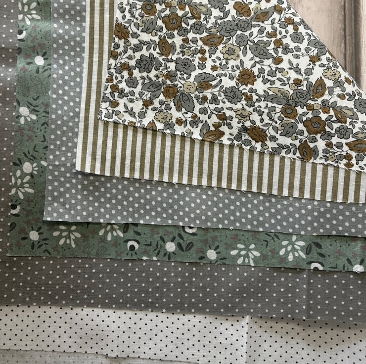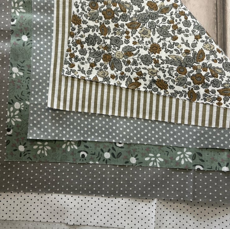 49cm square, set of 6 cotton fabric pieces in shades of brown, grey and white. Leaves, Stripes, White polka dot on grey, Leaves on Green, Grey polka dot on white, White mini polka dot on grey. Brand new.