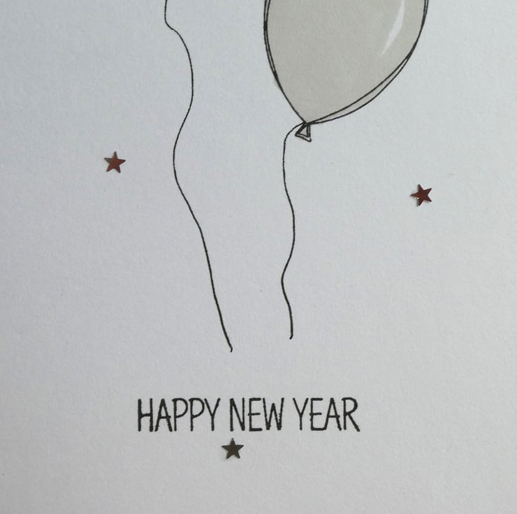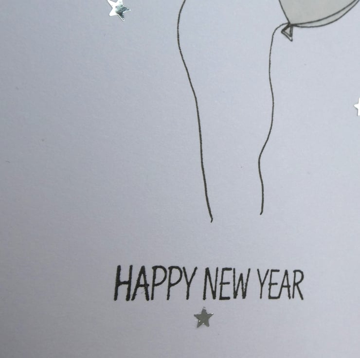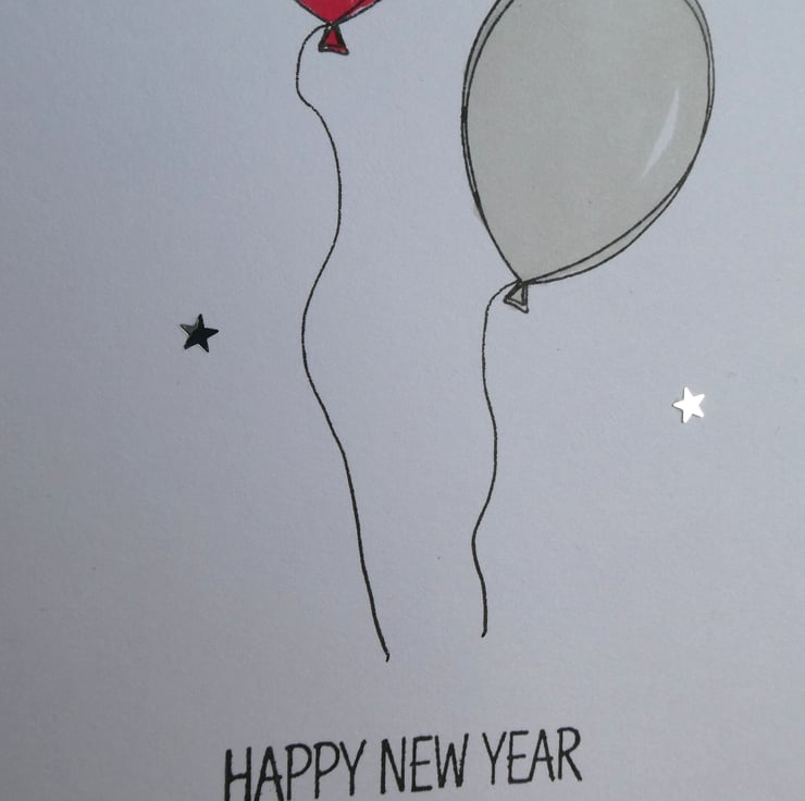 This Happy New Year card has been hand stamped with balloons and finished with star shaped silver sequins.