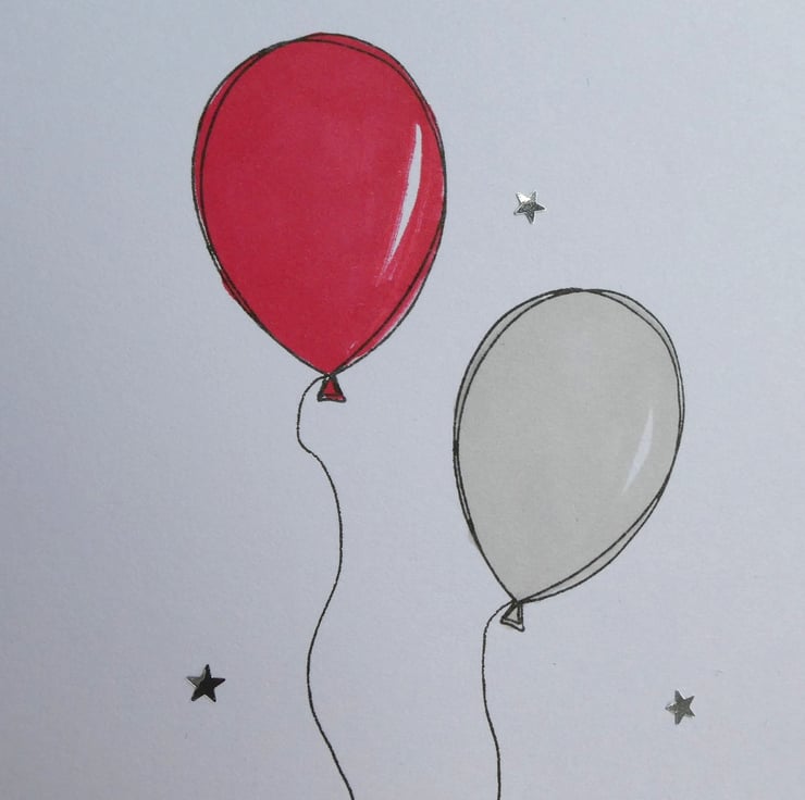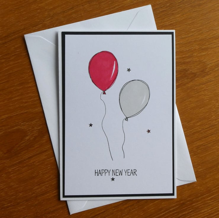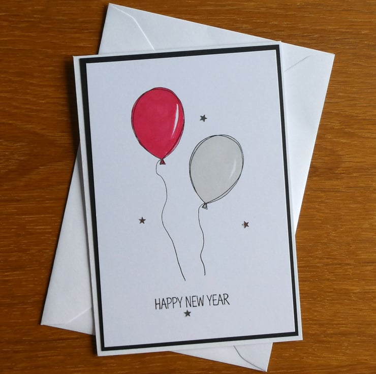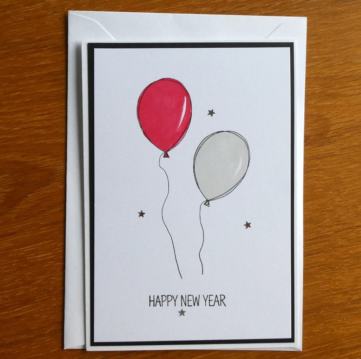 Two balloons have been stamped and coloured with red and silver ink. Hand drawn strings have been added and the message Happy New Year stamped in black archival ink at the bottom.
