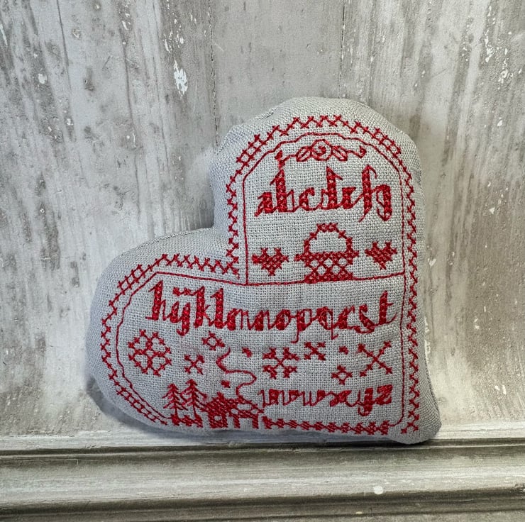Bowl Filler machine embroidered cross stitch design. Measuring 5” x 4.5”. Grey pre washed linen fabric filled with polyester fibrefill. Little pillows of fun. This design represents a Heart. Select 1 or fill a bowl full of Winter colours.